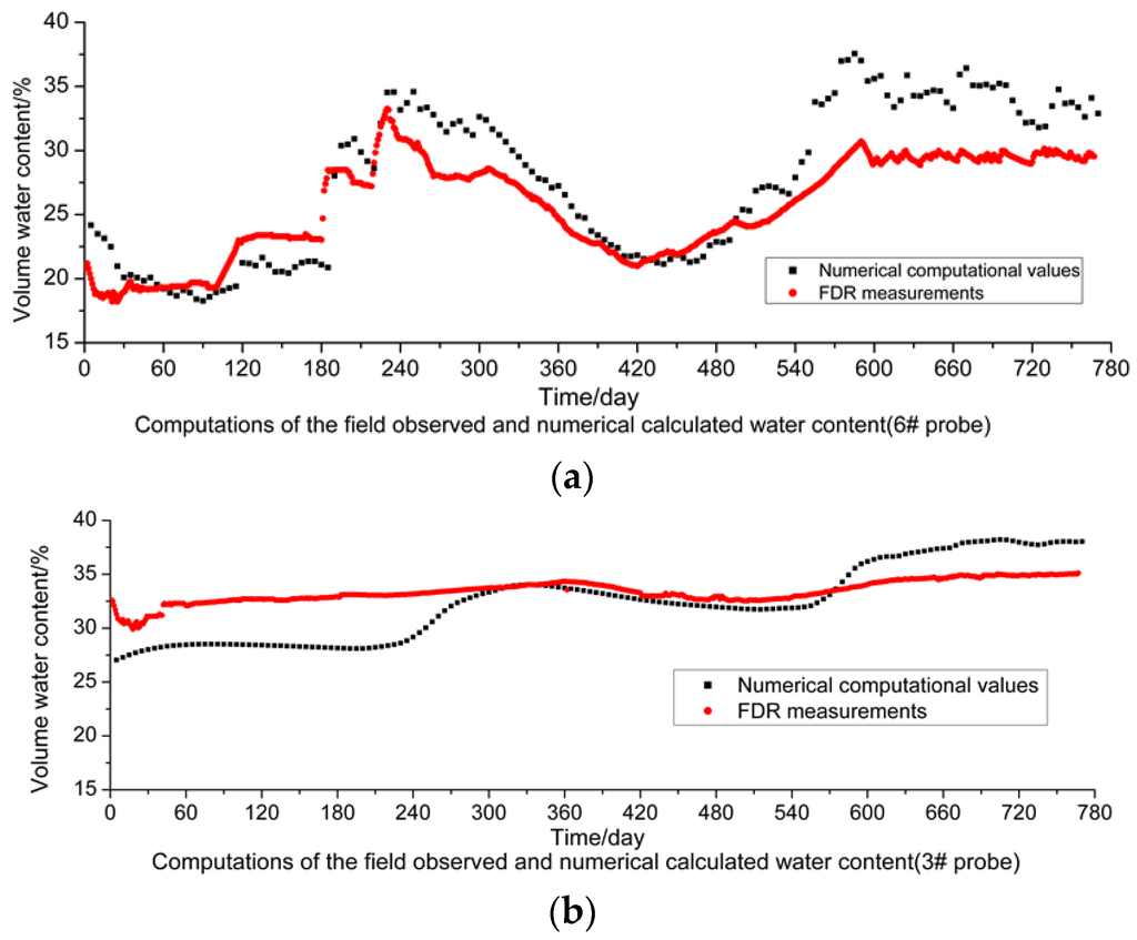 From Figure 13b, the volumetric moisture content values measured by sensor #3 are close to the values obtained through numerical calculations. However, the change amplitude of the moisture content values measured by sensor #3 is obviously lower than that of values measured by the sensor #6. According to careful analysis, this is because probe #3 is 5 m away from the subgrade slope and subject to slighter direct climatic condition influences than sensor #6. Additionally, the change amplitude of the moisture content values measured by sensor #3 is not as large as that of the values obtained through numerical calculation. The reason is given as follows: the increase or decrease of the moisture content in the subgrade soil mass is realized by the infiltration or evaporation of rainwater outside; in numerical calculation, it is assumed that subgrade soil is uniform; however, the subgrade soil mass is actually a heterogeneous body, so the effects of infiltration or transpiration on different parts of the subgrade are not consistent, which gives rise to the inconsistency of moisture content in the subgrade soil mass.
