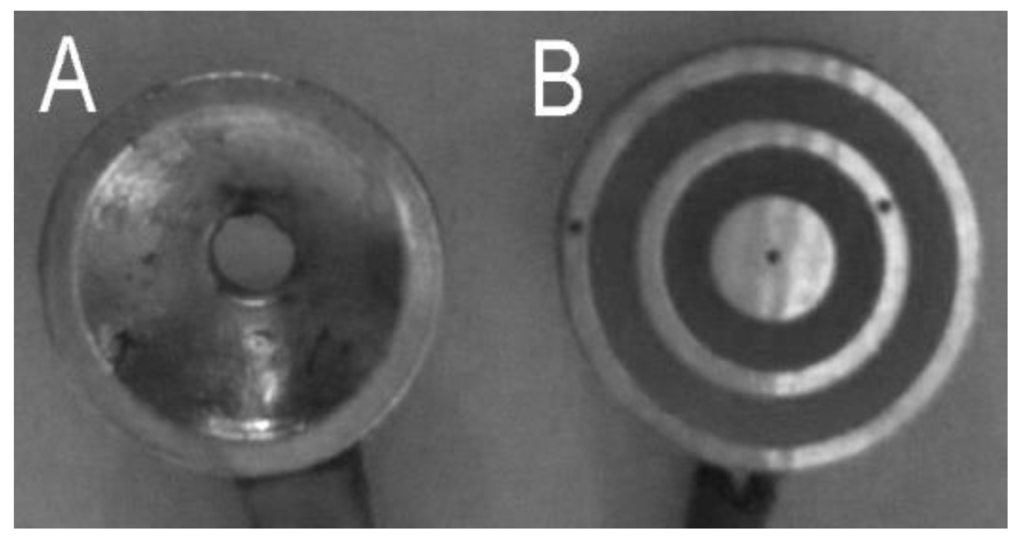 Conventional disc electrode (A) and tripolar concentric ring electrode (B).