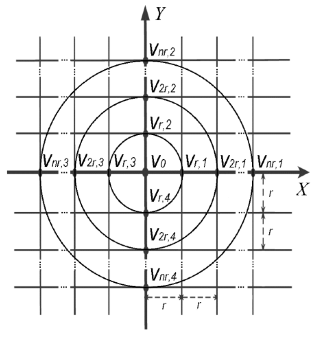Finally, generalizing Equations (2) and (3) for a case of multipolar CRE with n rings (n ≥ 2) we obtain a set of n FPM equations, one for each ring with radii ranging from r to nr (v0, vnr,1, vnr,2, vnr,3 and vnr,4 on Figure 2) around the point with potential v0 []: