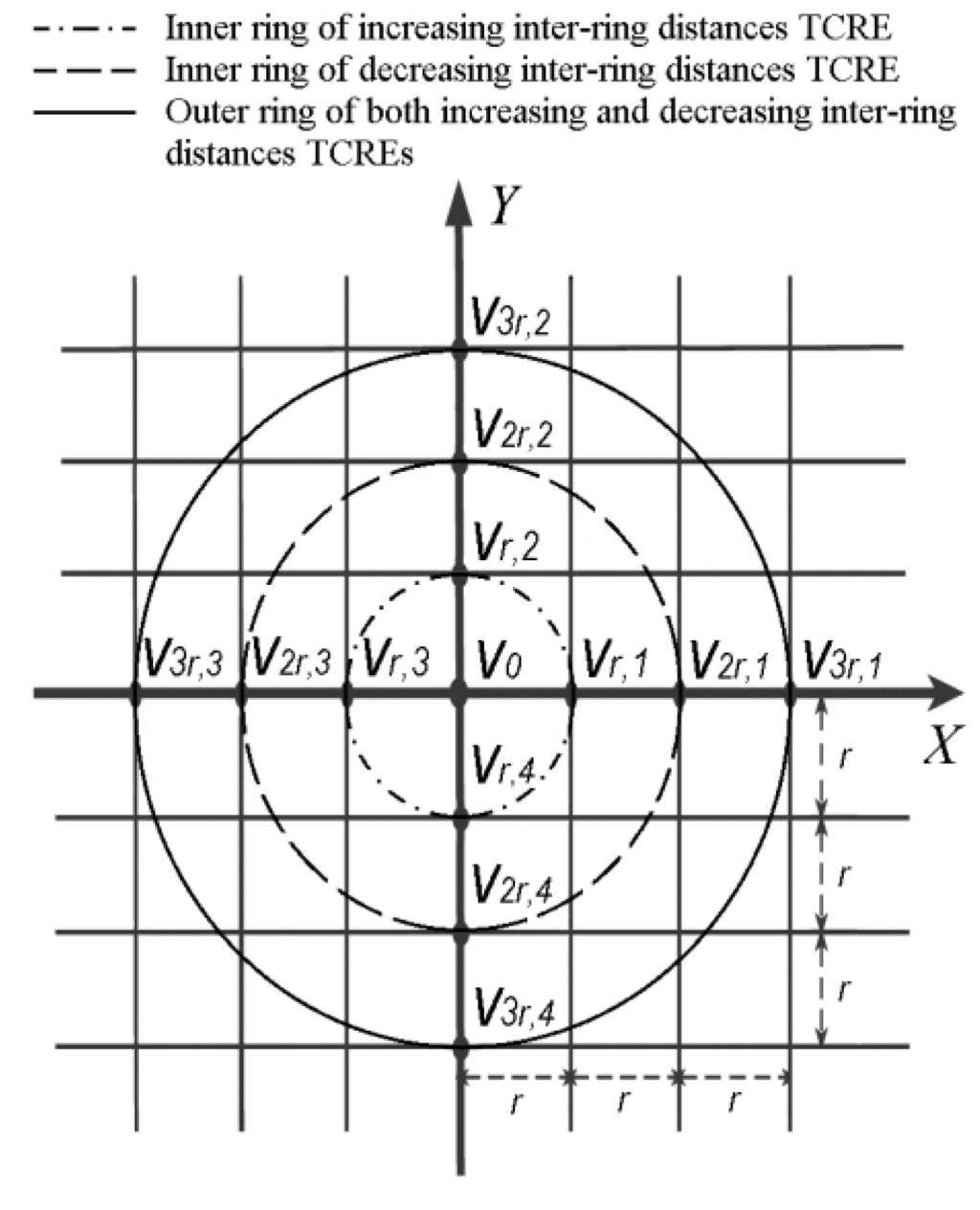 In Reference [] general (4n + 1)-point method for constant inter-ring distances (n + 1)-polar CRE with n rings was proposed. It was derived using a regular plane square grid with all inter-point distances equal to r presented in Figure 2.