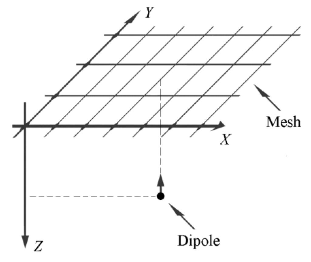 At each point of the mesh, the electric potential ϕ generated by a unity dipole was calculated with the formula for electric potential due to a dipole in a homogeneous medium of conductivity σ []: