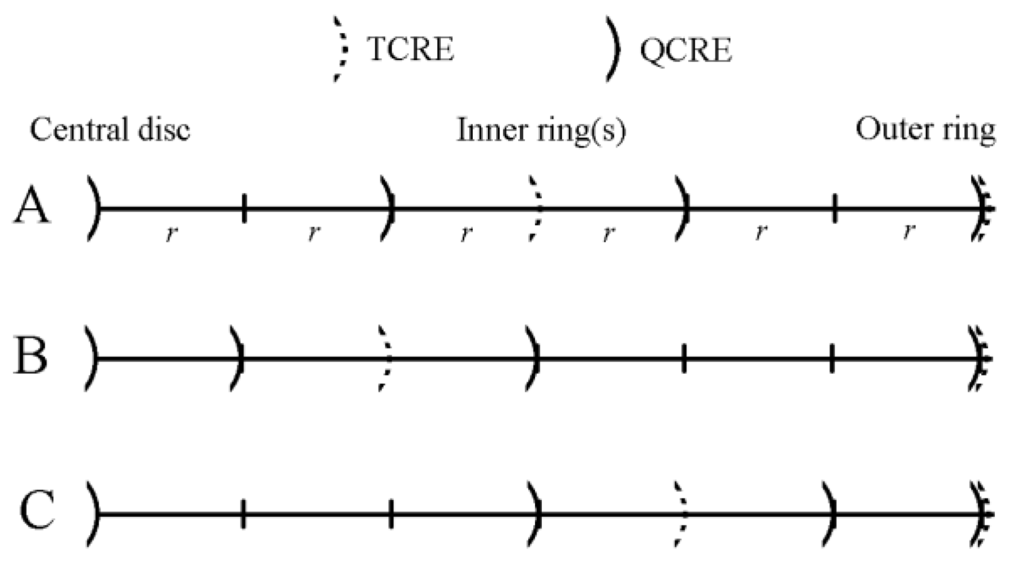 Relative locations of rings, with respect to the central disc, for constant inter-ring distances (A), increasing inter-ring distances (B), and decreasing inter-ring distances (C) TCRE and QCRE configurations.