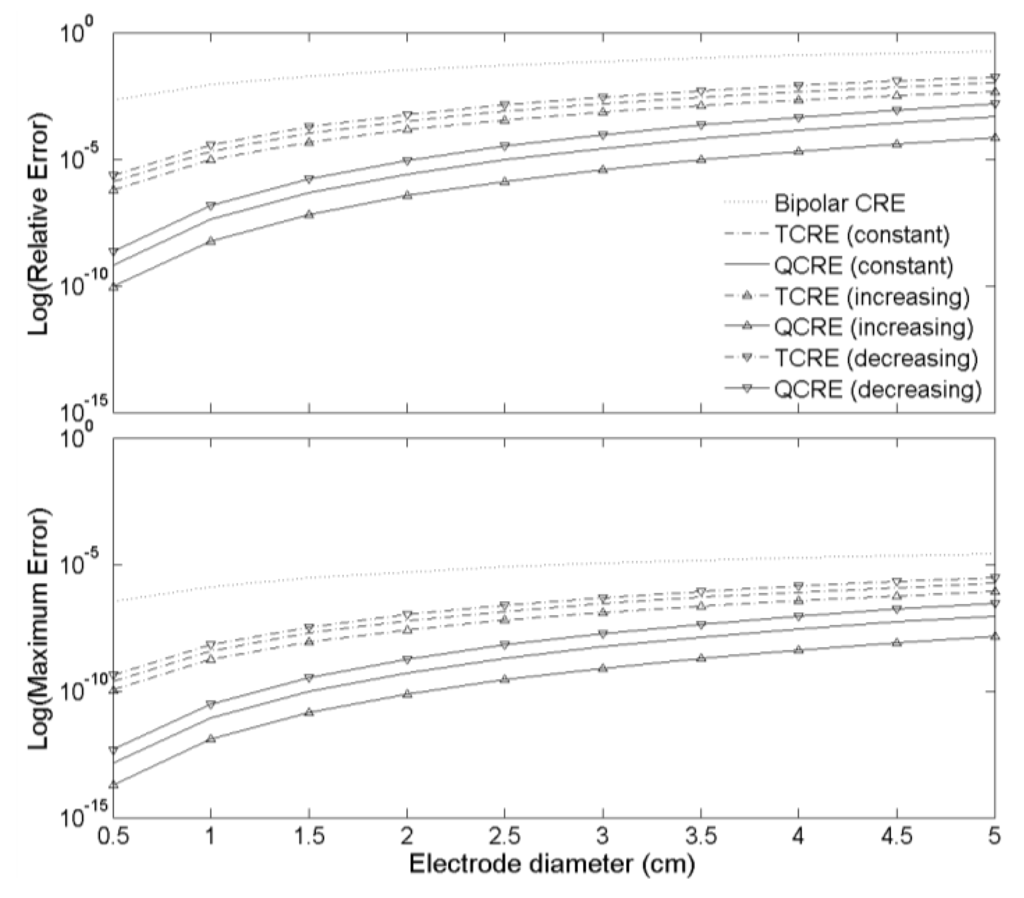 The FEM modeling results of two error measures computed for seven Laplacian estimation methods corresponding to seven CRE configurations using Equations (12) and (13), respectively, are presented on a semi-log scale in Figure 6 for CRE diameters ranging from 0.5 cm to 5 cm.