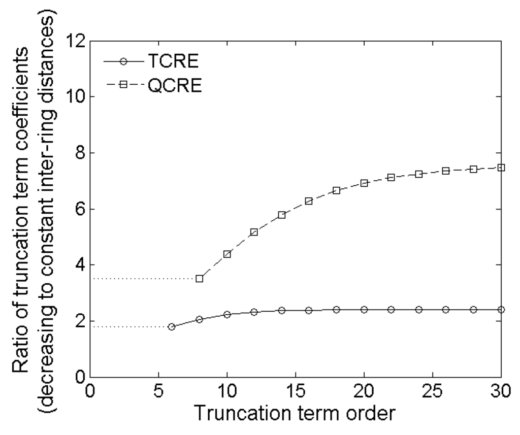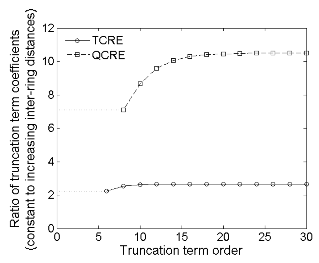Ratios of decreasing inter-ring distances to constant inter-ring distances truncation term coefficients as functions of the truncation term order for TCRE and QCRE configurations.
