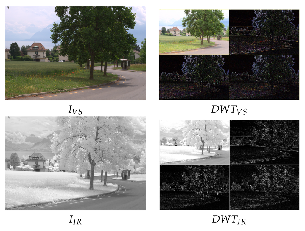 Wavelet theory has been largely studied in digital signal processing and applied to several subjects (from noise reduction [24] to texture classification [25], just to mention a couple). At this section, the basic concepts and elements of Discrete Wavelet Transform (DWT) in the context of image fusion are introduced. Let and be the original images, of pixels, in the visible () and infrared () spectra respectively (IR refers to both NIR and LWIR images). Let be the image, also of pixels, resulting from their fusion. In the wavelet-based image fusion, the given images are decomposed at their corresponding approximation (A) and detail (D) components, which correspond to the lowpass and highpass filtering for each decomposition level. These decompositions can be represented through sub-images. The detail representations correspond to the vertical details (), horizontal details () and diagonal details () respectively. Figure 1 (Right) depicts illustrations of one level DWT decompositions obtained from the original images Figure 1 (Left) (different approaches used to decompose the given images are introduced in Section 2.1).