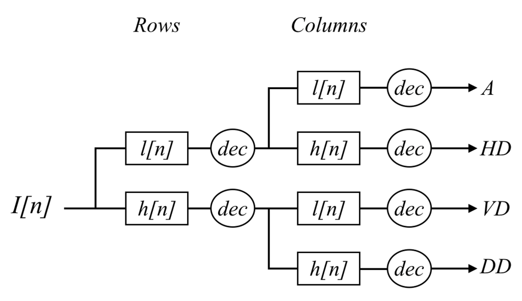 Decimated: In this case the approximation and details images are downsampled after each level of decomposition (in case of multi level decomposition), keeping one out of every two rows and columns. As previously mentioned, the wavelet and scaling functions can be viewed as high and low pass filters, respectively. Because these filters are one dimensional, when dealing with 2D images the process consists of applying these two filters first to the rows and then to the columns. Figure 3 presents an illustration of this concatenation of high (h) and low (l) pass filters applied to the rows and columns of a given image in order to obtain the approximation (A) and details (HD, VD, DD).