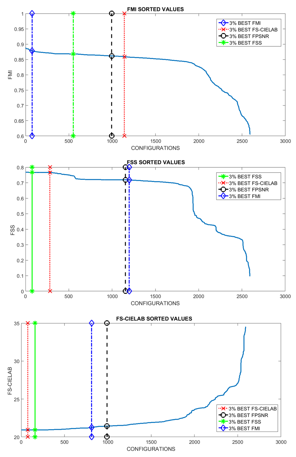 Looking at the resulting plots we try to identify the evaluation metric that should be used to select the best setups (i.e., configurations). Hypothetically, the best configurations at a given metric should be also among the best ones when they are considered under a different evaluation metric. Although this is not exactly the case if we look at Figure 4, we can appreciate that in the last three plots, the ones corresponding to FMI, FSS and FS-CIELAB metrics, there is not a big change in performance when different top best 3% configurations are considered. This behavior does not hold when the FPSNR metric is considered. In this case we can appreciate that there is a larger decrease in performance when the top best configurations from FSS and FS-CIELAB metrics are considered. Table 3 presents the percentages of decrease when the different metrics are considered. In summary, we can conclude that selecting the configurations, based on FPSNR or FMI metrics, represent a good choice since these configurations return good results even when other metrics are considered.