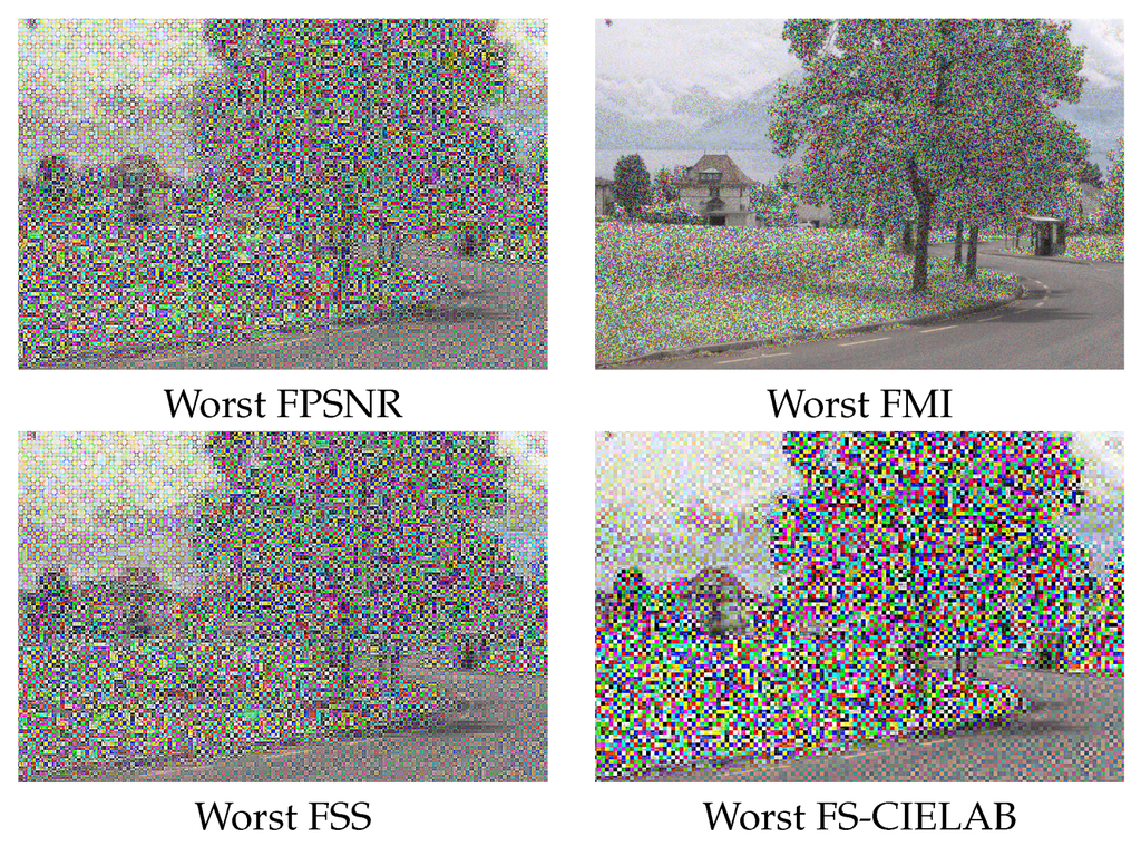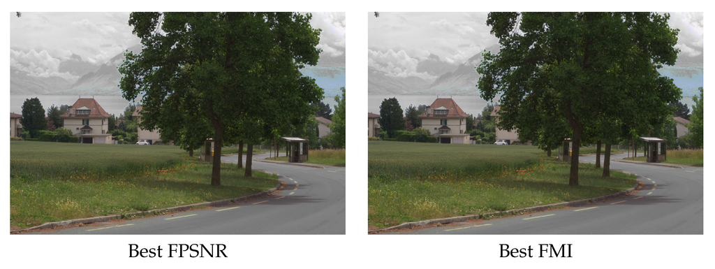 In order to validate the obtained results, a new set of images corresponding to other categories from [33], has been evaluated—2 pairs (VS and NIR) of images per category are randomly selected (some of them are depicted in Figure 7). In this case, the top best setups (configurations) from the FPSNR evaluation metric have been considered since they are the most stable when considered under other evaluation metrics. Results obtained from this new data set have similar behavior than the ones obtained in the pair of test image (see Figure 1); actually, the values have the same order of magnitude. The only exception comes when measuring FS-CIELAB with pair of images from severely different environments than the pair of image used in the study (the test image). The test images were selected from the country folder, and these exceptions come when measuring FS-CIELAB from environments such as old building, street and urban categories. This leads us to the conclusion that FS-CIELAB behaves differently according to the nature of the environment. This conclusion needs to be studied and validated in a further research. In summary, our selected best configurations behave good enough when other set of images are considered; hence, we can conclude they are the best options for fusing cross-spectral images independently of the environment and nature of the images.