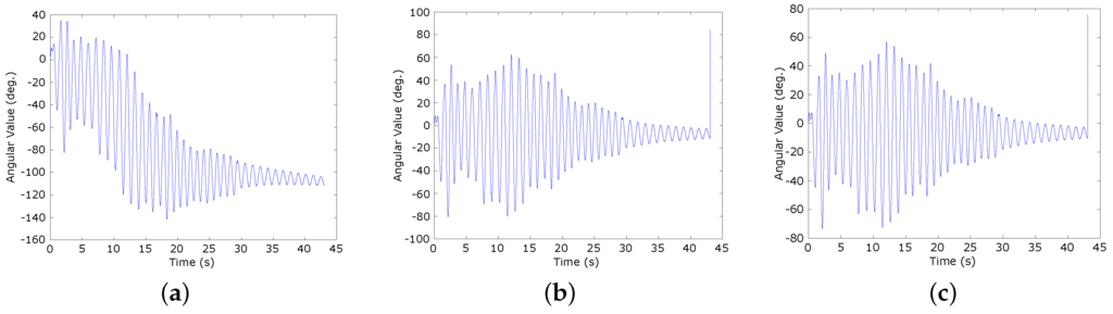 Under the same analysis as applied to the accelerometer sensor, Figure 5a–c show the results of the Euler pitch angle calculation by using a separate gyroscope sensor, our proposed solution, and the encoder, respectively. Unlike the accelerometer sensor, the separate gyroscope sensor can follow the progress of angle changes. However, due to the shortcoming physical characteristics, the gyroscope sensor has a gyro drift problem that distorts the shape of the graph over time (see Figure 5a). On the other hand, with our proposed solution, the sensing information from the gyroscope sensor and accelerometer sensor is fused to compensate for each other. As a result, the output value is approximately the same as the value provided by the encoder (see Figure 5b,c).