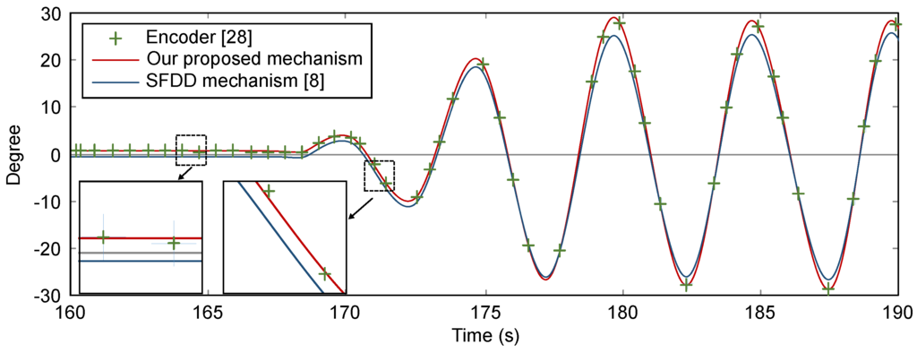 Figure 4a–c show the results of Euler pitch angle calculation by using a separate accelerometer sensor, our proposed solution, and the encoder, respectively. The values and line graph shapes indicate the equivalence between our proposed solution and the encoder. However, the result of the separate accelerometer sensor is different, except the trend of the line graph. The reason is the accelerometer sensor does not respond quickly to changes of the status during high speed motion. In this Figure 4b, with our proposed solution, even though the angles are calculated by using the acceleration sensor, the result can follow the progress measured by the encoder very well without any negative effects resulting from the translational motion.