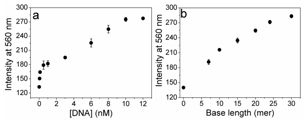 (a) Fluorescence intensity of PFVCN/ssDNA in Tris-HCl buffer solution (20 mM, pH 7.4) with different concentrations. [ssDNA] = 0−12 nM; (b) Fluorescence intensity of PFVCN/ssDNA in Tris-HCl buffer solution (20 mM, pH 7.4) with different base lengths. [PFVCN] = 1.0 × 10−6 M, [ssDNA] = 10 nM, [WS2] = 1 μg/mL. The error bars represent the standard deviations of three parallel measurements. The excitation wavelength is 470 nm.