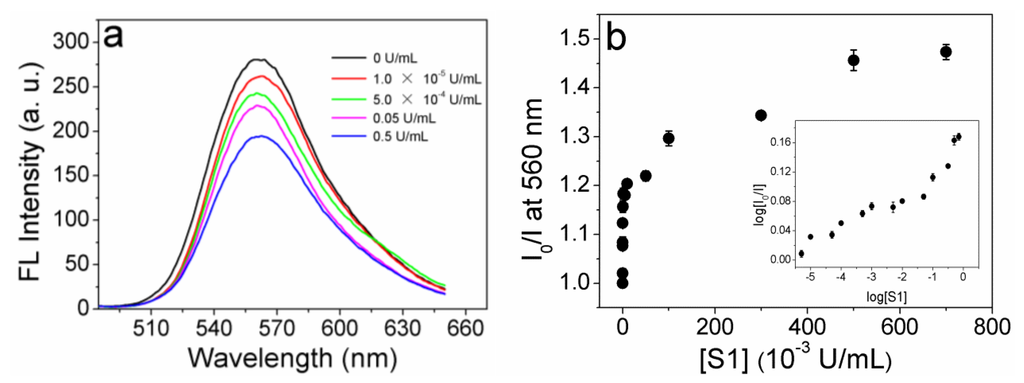 The detection of endonuclease activity is essential because endonuclease plays an important role in many biological processes. Endonuclease has been widely used as a tool to remove non-annealed polynucleotide tails and hairpin loops in RNA and DNA duplexes, molecular cloning, and gene analysis [1,2,3]. S1 nuclease, a well-known multifunctional endonuclease, can hydrolyze ssDNA or RNA into 5’-phosphomononucleotide and 5’-phosphooligonucleotide and is employed as a model system. S1 nuclease has been particularly used to probe the disruption of the DNA structure by numerous carcinogens and antimitotic drugs [4]. Numerous methods based on advanced materials have been developed to detect S1 nuclease, such as colorimetric, electrochemical, and fluorescent assays [5,6,7,8,9,10]. However, most of these methods have some drawbacks, such as low detection limits, high cost and/or time-consuming assay procedures.