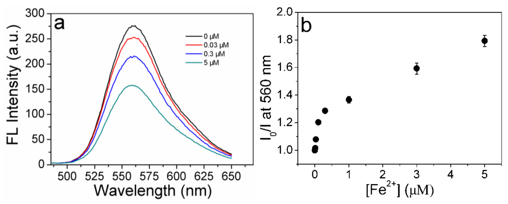 Hydroxyl radicals can damage virtually all types of macromolecules, such as carbohydrates, nucleic acids and lipids; this damage is highly dangerous and toxic to organisms. Assays for DNA cleavage by hydroxyl radicals can be performed by using a similar approach with the addition of Fenton’s reagent (Fe2+ + H2O2). Fenton’s reagent generates hydroxyl radicals that randomly cut DNA into different sequence fragments and even single bases. Fenton’s reagent ([Fe2+]:[H2O2]:[DTT] = 1:10:10) was chosen here to generate hydroxyl radicals. To study the activity of hydroxyl radicals, we measured the fluorescence spectra in 20 mM Tris-HCl buffer at pH 7.0 ([PFVCN] =1.0 × 10−6 mol/L in RUs, [ssDNA] = 1.0 × 10−8 mol/L, [WS2] = 1 μg/mL) at various concentrations of Fe2+ (from 0.01 μM to 5 μM). Figure 4a shows that the fluorescence of PFVCN gradually decreases with the increasing of Fe2+ concentration, which results from the nucleotide acids being cleaved by hydroxyl radicals and gradually being reduced by Fenton’s reagent. Figure 4b shows that the fluorescence intensity ratio (I0/I) of PFVCN increases with the increasing of Fe2+ concentration, where I0 and I are the fluorescence intensities of the sensor solution in the absence and presence of Fenton’s reagent, respectively. The concentration of hydroxyl radicals was related to Fe2+, and the detection limit was 0.01 μM. The result indicates that our new platform also can be used to detect hydroxyl radicals sensitively and simply.