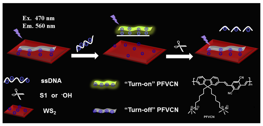 In this paper, we design a new approach to detect the activity of the S1 nuclease and hydroxyl radicals based on water-soluble PFVCN and WS2 nanosheets. In our strategy, PFVCN can be absorbed on the surface of single-layer WS2 nanosheets via electrostatic interactions, and WS2 nanosheets act as an efficient quencher for PFVCN [29]. When ssDNA is added, the fluorescence of PFCVN is recovered to some extent because of the much stronger electrostatic interaction between PFVCN and the ssDNA probe, leading to PFVCN leaving the surface of WS2. Upon addition of S1 nuclease or hydroxyl radicals, the ssDNA probe is hydrolyzed into small fragments, and PFVCN is adsorbed on the nanosheets, resulting in the fluorescence of PFVCN being quenched. Thus, S1 nuclease activity and hydroxyl radicals can be measured by monitoring the PFVCN fluorescence intensity, which is cost-effective, sensitive and label-free without the need for dye labeling of the ssDNA. This platform composed of WSCPs and WS2 also provides a new sensing system for biosensors.
