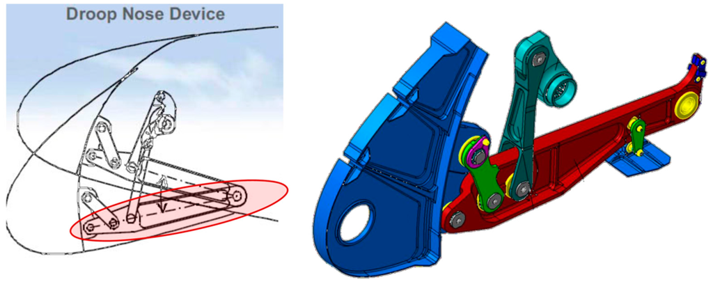 Schematics of the hinge arm of the droop nose mechanism on the Airbus A380 wing leading edge (side section) [,].