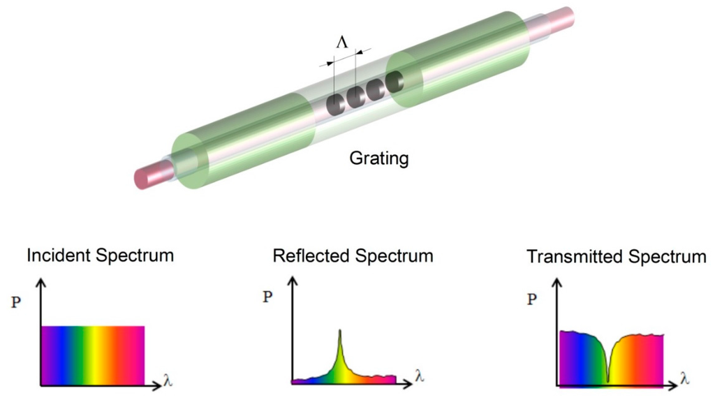 where neff is the effective refractive index of the grating and Λ is the grating period. Typical Bragg wavelengths are in the range of 830, 1300 or 1550 nm, depending on the grating inscription technology used and the fibre optic core refractive index. The great advantage of this technology lays in the fact that the grating period can be tuned in such a way to have a specific Bragg wavelength, hence allowing inscribing multiple gratings on the same fibre optic line and reading them out on a single channel. An arbitrary variation of strain and temperature applied on the grating will induce a shift on the Bragg wavelength, according to Equation (2) []: