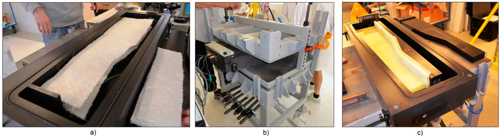 The A380 hinge arm was the final result of the European AISHA II project, which was intended to prove the feasibility of translating the design of an existing metal component into a composite one []. The component was made via the RTM process, by means of an alternating pump which was used to mix the epoxy resin and inject it into the mould. The latter was made of a lower part and an upper lid closed and sealed together with the inner composite preform being impregnated by the flowing resin. In Figure 3 an overall view of the mould and of the component during the production stages is presented. In order to obtain the vacuum and pressure tightness, a clamping frame—Figure 3b—was used to apply a contracting mechanical pressure on the mould lid. The mould had an inlet at one extremity and an outlet on its diagonally opposite end.