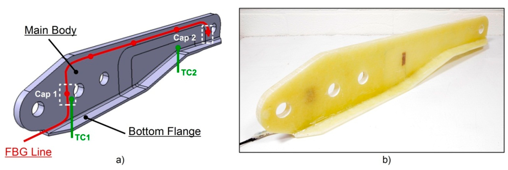 The strains have been derived from the FBGs wavelength peak shift throughout the curing and the post-curing processes. For the RTM curing process of the A380 hinge arm a Micron Optics® (Atlanta, GA, USA) static interrogator sm125–500 with 1510–1590 nm bandwidth and a wavelength repeatability of ±0.2 pm was used. For the oven post-curing a FBG-Scan804 interrogator from FBGS® Technologies GmbH (Jena, Germany) was used, instead. The latter had a 1510–1590 nm bandwidth and a wavelength precision of ±1 pm. The optical fibre sensor lines were DTG® from FBGS® Technologies GmbH having inscribed FBGs in the range of 1510–1590 nm []. The cladding diameter was 125 μm and the fibres were coated with an organic modified ceramic (Ormocer®) material with an overall outer diameter of 195 μm.