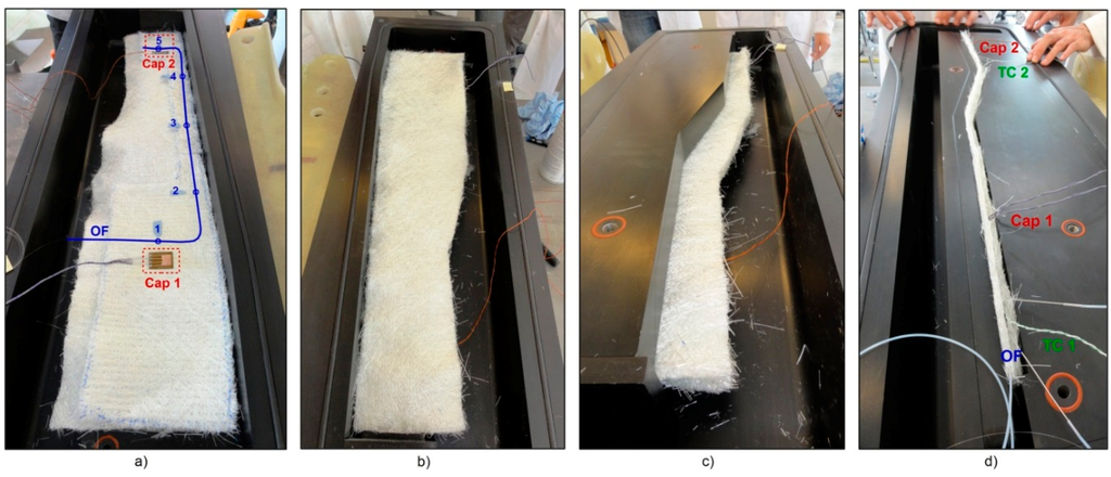 Preform preparation and sensors embedding step sequence for the A380 hinge arm. Sensors layout (a); preform preparation (b); positioning of the top mould insert (c); positioning of the bottom flange insert (d).