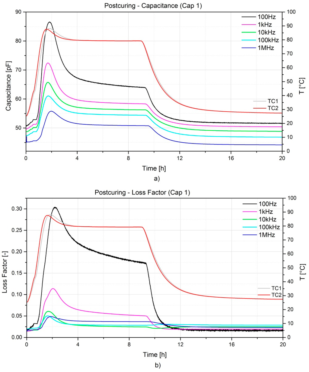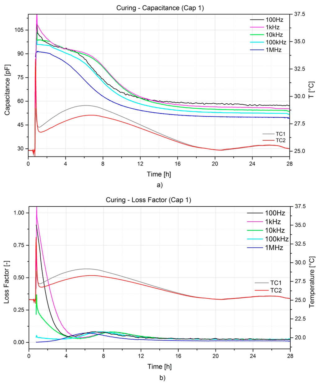 The frequency dependency on the measurements is remarkable; generally, lower frequencies show higher sensitivity, but are more influenced by noise. On the contrary, higher frequencies show a lower variation of the measured magnitudes. Depending on the resin system and its curing kinetics, an optimal frequency can be selected. In the case presented the optimal frequency was found at 10 kHz, as a good trade-off between noise and sensitivity. Moreover, measurements are also temperature dependent as it can be noticed from Figure 7 during the oven post-curing. Shortly after the heating step (1 h), a considerable increase of both capacitance and dissipation factor is noticeable and this is directly connected to the amount of latent curing which is activated during the heating. This peak levels off to a constant value which reflects the pure influence of temperature on the measurements. In addition, the peak exhibits a shift in time when higher frequencies are considered. The final values of both capacitance and dissipation factor after cooling down are comparable with the initial ones, lower frequencies show slightly higher values with respect to the initial, while higher frequencies show slightly lower values. The noise influence on the measurements was rather limited for the post-curing if compared to the curing process; this can be related with the ion diffusion and the dipole oscillation becoming limited as the resin solidifies.