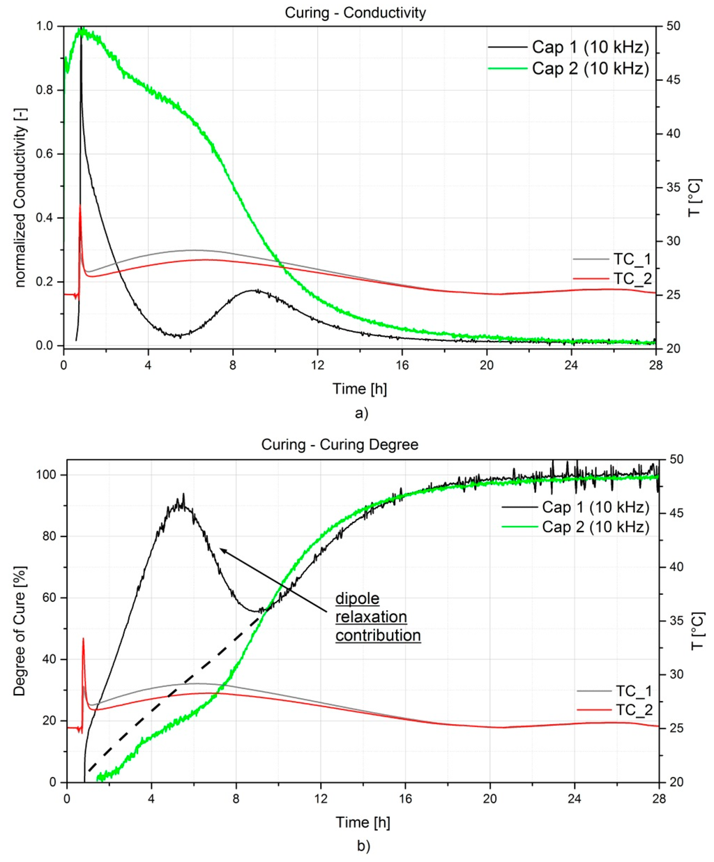 The ion conductivity σ [S/cm] is often used to define the curing behavior of a resin system, since it describes better its changes in physical properties (i.e., viscosity, degree of cure). As mentioned in Section 3, the step from the loss factor to the ion conductivity can only be made under the condition that the contribution of the dipole relaxation to the loss factor is negligible (i.e., Equation (11)). This is verified when the ion conductivity curves overlap (no frequency influence) at least in the early curing stage. The selection of the optimal frequency is of importance to define a meaningful curing profile curve. Low frequencies are preferable at early curing stage, since typical dipole relaxation time is low, but low frequencies are more susceptible to electrode polarization effects occurring when the ion mobility is high. The ideal frequency should not be influenced from both dipole relaxation and electrode polarization [,]. Furthermore, as the curing evolves the ion mobility and dipole movements become restricted and therefore higher frequencies describe better the end-of-curing behavior []. For this resin system, the optimal frequency was selected at 10 kHz. The conductivity was derived from the dissipation factor according to Equation (11) and normalized. The resulting curves of the two sensors are depicted in Figure 8a. As one can notice, a difference between the curve trends exists, even when the same frequency was considered. This is highlighted also in Figure 8b, Cap 1 (i.e., LCR meter measurements) where a sudden increase of the degree of cure is followed by an unexpected decrease, which does not have a physical meaning. This might be due to the contribution given by the dipole losses at the early stage of curing, which needs to be subtracted when defining the degree of cure. Some resin systems can even contain a high level of ionic particles (additives or impurities), which will gather at the sensor electrodes. This will result in a much higher initial conductivity value. As a consequence, any dipolar loss peaks in the first stage of curing can be masked and left completely unnoticed. The same can occur if the sensor design is susceptible to ion polarization disturbances. On the other hand, an accurate read-out apparatus and a good sensor design can allow for a more precise measurement of the capacitance and dissipation factor. This will highlight, if present, any peak related to the dipole relaxation as it is seen on the black curve in Figure 8b related to Cap 1, which exhibits a peak at 5 h from the beginning of the curing. This however does not affect the later stage of the curing, since the increased cross-linking limits the dipoles movement and the contribution of the ion conductivity prevails. In fact, approximately 9 h after the resin injection, the two curves begin overlapping. After approximately 20 h from the injection, one can observe a cure degree of about 98% and not further increase has been captured afterwards. It is important to mention that the 100% degree of cure has been defined for a 30 h curing cycle at room temperature, but during the following post-curing some additional reaction has been noticed, as already reported in Figure 7.