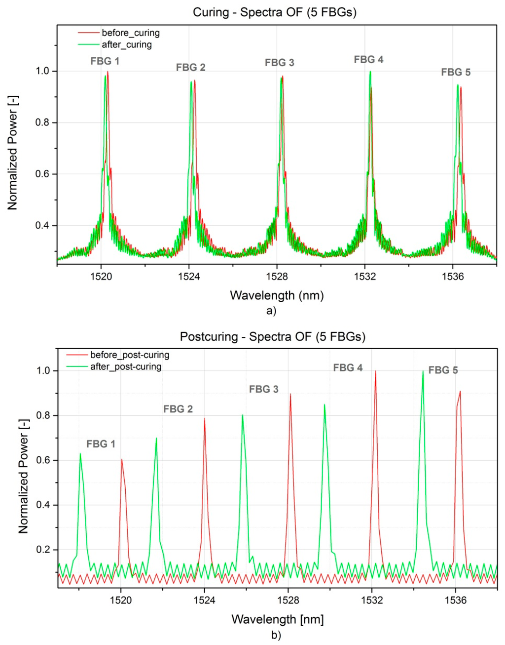 In Figure 9a,b the full spectra acquired before and after RTM production and before and after post-curing are presented. For clarity, the spectra referring to the curing were acquired once that the mould was closed, so prior to the injection, and after 30 h curing before the demoulding. No peak distortion was observed, but in general a lower peak reflection could be seen after post-curing. This has nothing to do with a physical effect on the embedded sensors, but most probably it is related to a non-optimal selection of the integration time for the spectra on the interrogator acquisition software. It is worth to mention that in spite of this, the accuracy of the measurements is not compromised.