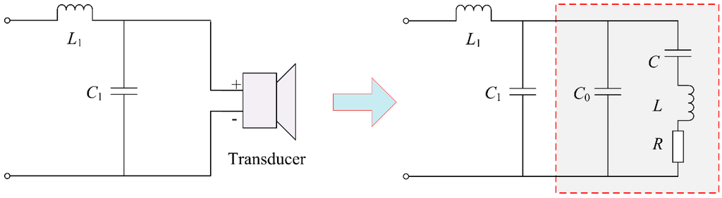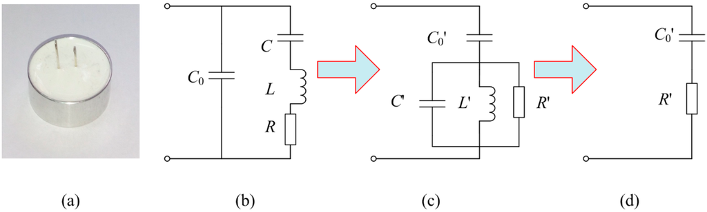 When the transducer’s parallel branch is resonant, in other words, working at a parallel resonant angular frequency, the reactance of L, C and C0 will be counteracted and the transducer may be equivalent to Figure 2c. C′0, C′, L′ and R′ are respectively the static capacitance, the dynamic capacitance, the dynamic inductance, and the dynamic resistance of the piezoelectric transducer after equivalent transformation. Then, the equivalent circuit can be simplified into Figure 2d through further equivalent transformation []. Relevant calculations are expressed as follows: