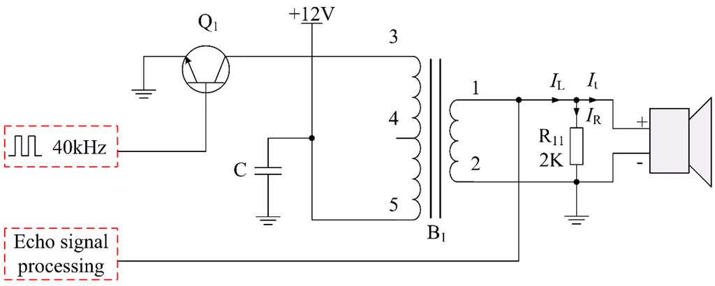 Compared to the non-waterproof transducer, the waterproof piezoelectric transducer with an integrated transceiver can be used in harsh environments. However, it has lower transmitting and receiving efficiency []. The waterproof piezoelectric transducer with an integrated transceiver cannot be driven directly by a microprocessor. Therefore a specially designed driving circuit is required. For the ultrasonic ranging sensor, a power supply circuit and a driving circuit are the main energy circuits. A typical driving circuit of conventional ultrasonic ranging sensor is shown in Figure 4.