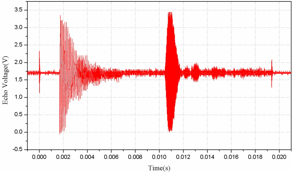 The transmitting pulses produced by the novel approach of driving current are shown in Figure 9. Due to the resistance distribution of current limiting resistor and opto-coupler, a pulse string, composed of about 16 V and 40 kHz pulse signals which is controlled by GM3101, will be sent to the anode of the transducer. The time of the stage A, when the sensor is transmitting pulses, is TA = 16 × 25 μs = 400 μs. After transmitting the pulses, the microprocessor will turn off the opto-coupler and the transducer will go to the stage of aftershock (C) before the echo receiving stage. In order to distinguish the aftershock signal and the echo signal, a period of aftershock shielding time is necessary, after which the proposed sensor begins to detect an echo. In Figure 9, B represents the stage of aftershock shielding. Obviously, TB is much larger than TC. After designing and implementing the driving circuit, we take a waterproof piezoelectric transducer with an integrated transceiver for experiments to test its driving ability. Tests have been done in various distances of the target object, and the echo waveform in 185 cm is shown in Figure 10. We can find that the echo voltage is still very large (about 1.75 V) in such a long distance, which shows that the proposed novel driving circuit has a pretty good performance in driving the waterproof piezoelectric transducer with integrated transceiver.
