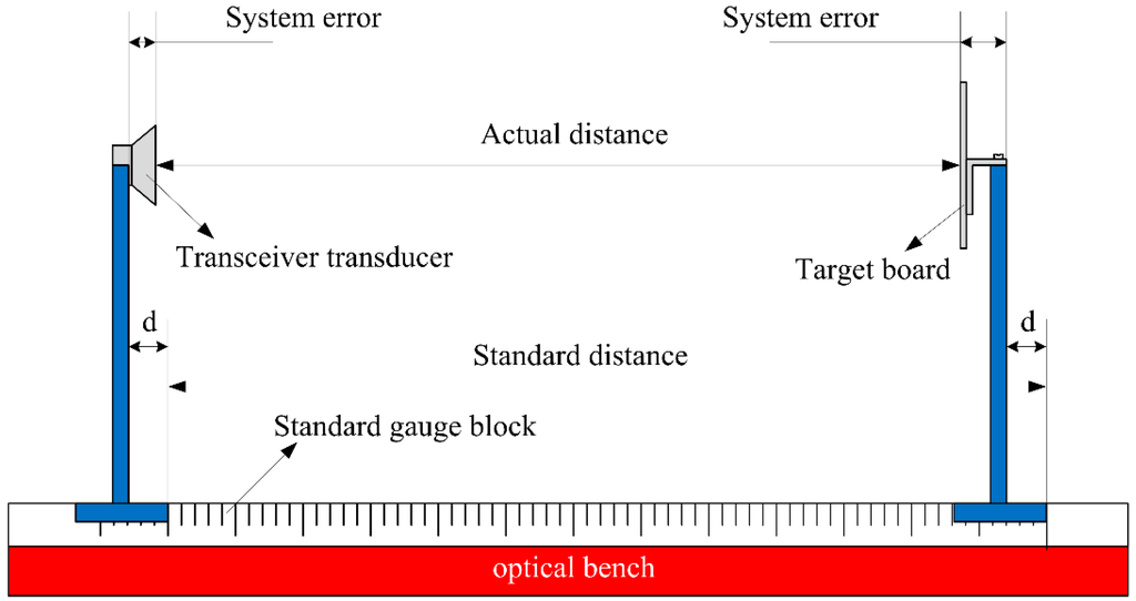 The schematic diagram of the experiment platform (side view) is shown in Figure 13. From Figure 13, it can be observed that the value read from the standard gauge block is not the actual distance between ultrasonic transducer and target board, due to the errors of test platform. In fact, there is a system error between them, and the actual distance can be expressed as follows: