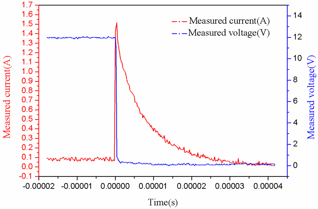 In Figure 16, the part indicated with red font is the schematic diagram of the short-circuit testing apparatus. K is a button switch. The sensor works normally when K is disconnected. However, the output terminal of the energy limiting circuit will be shortened when K is pressed down. The voltmeter and ammeter in testing apparatus are used to measure the voltage and current of the circuit. An oscilloscope is utilized to observe the state of voltage and current in the short-circuit process. The measured results are presented in Figure 17, respectively.