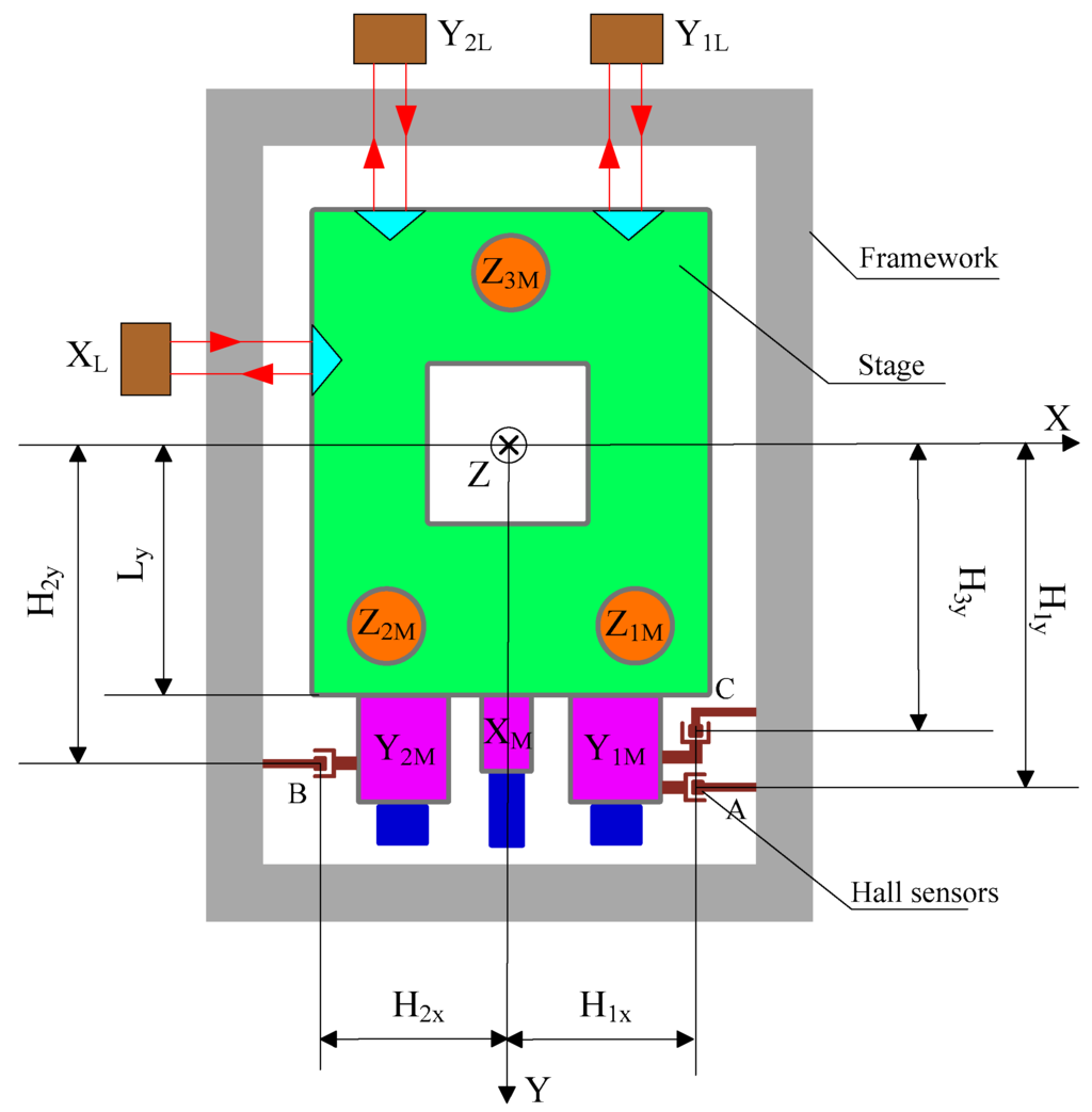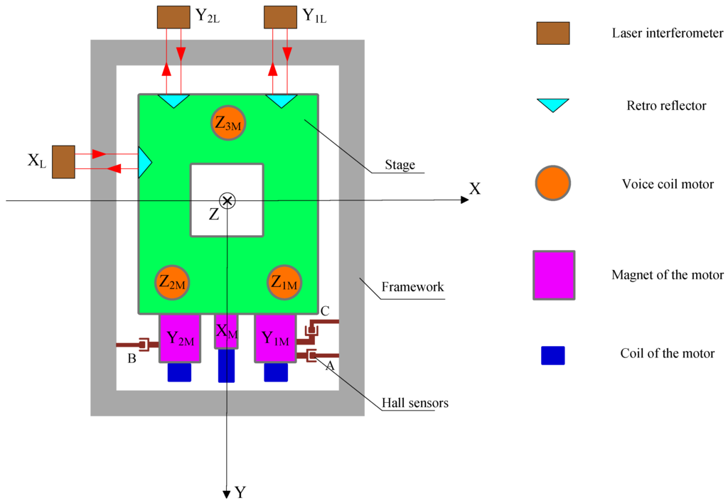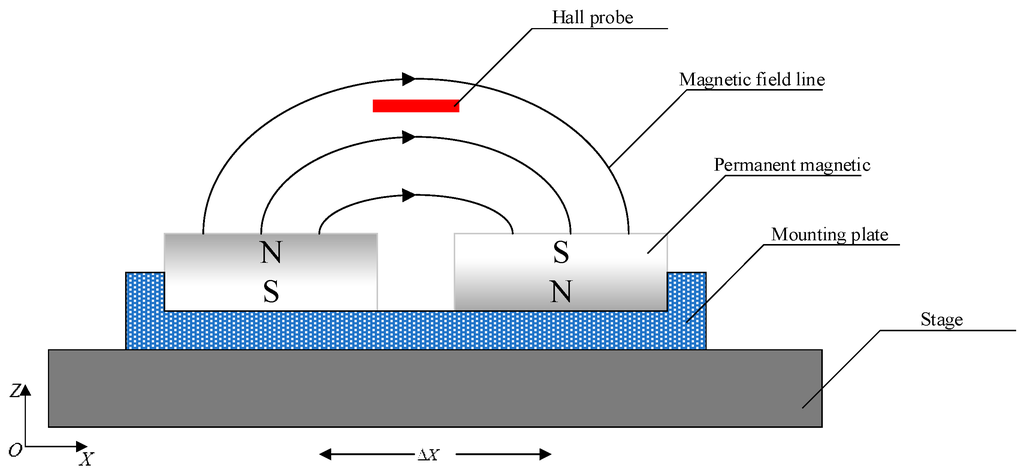 Precision motion stage is the kernel part of an ultra-precision system which has been playing a critical role in Integrated Circuit (IC) manufacturing, optical components production, Liquid Crystal Display (LCD) fabrication, IC encapsulation, etc. Increased demand is putting stricter requirements on the precision stage, especially on the accuracy of its multiple degree-of-freedoms (DOFs) movement. To achieve high precision positioning of the stage, a sufficiently accurate measurement system is indispensable, for the measurement error in the feedback channel of the control loop will directly affect the system performance and cannot be suppressed by the controller in the forward channel [1]. Since the 6-DOF displacements of a stage cannot be measured by a single sensor, a measurement system composed of multiple sensors is necessary. Mura measured a 6-DOF Stewart platform stage by constructing a sensor array, composed of wire extensometers or MEMS displacement sensors [2,3]. By solving the kinematic equations, the 6-DOF moving information could be estimated. Similarly, Allred used a simplified Stewart platform stage to measure the helicopter blade [4]. Kim made use of some cooperative targets to design a measurement coordinate system, and the system parameters were determined by optimization. Then, the 6-DOF displacements could be calculated by coordinate transform [5]. However, these methods are not effective for a non-cooperative and floating stage. As noncontact sensors [6,7], Hall sensors are widely used in various industrial applications, including position, velocity and magnetic fields measurement [8,9,10,11,12,13]. Also, it is shown to be insensitive to harsh environments. For measurement of a multi-DOF stage using Hall sensor, Zhao obtained an elliptic fitting function of the magnetic field for compensation, in the case that the height between the hall probe and permanent magnet is fixed [14]. To estimate the maglev stage in planar DOFs, Kawato adopted two-axis Hall-effect sensors, constructed a model of magnetic field distribution according to the Halbach magnet matrix, and developed a Gaussian least-squares differential-correction (GLSDC) algorithm [15,16]. Sun established the model of the magnetic field and displacement using finite element analysis, and presented a 3-DOF measurement algorithm based on symmetry and linearization [17].