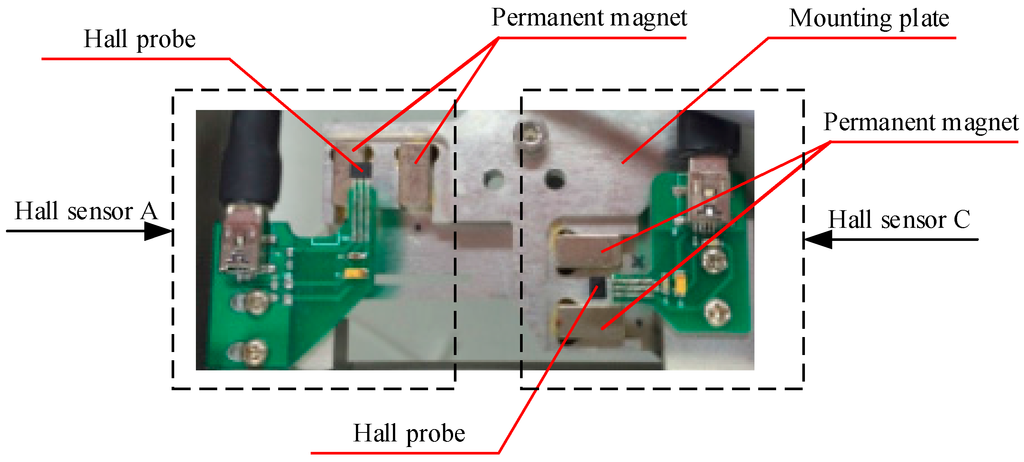 The motion of the stage is measured by the hall sensor array and the capacitance sensor. Three hall sensors, A, B, C, are responsible for measuring the displacement of the stage relative to the framework in the horizontal plane. Specifically, sensors A and B measure the relative displacements in the Y direction, and sensor C in the X direction. The output voltage of a Hall sensor is in direct proportion to the magnetic flux density where the sensor is placed, and zero output is desired in the middle of its measurement range. The structure of the Hall sensor used in the stage is shown in Figure 2, in which the structure of the magnetic steel is simplified for better versatility and easier installation. The Hall probe is fixed on the stage, while the permanent magnets are installed on the mounting plate. The dimension of the magnet is 12.7 mm × 6.4 mm × 6.4 mm, and the installation mount is designed to be 43 mm × 25.5 mm × 6.5 mm. With this configuration, an arc-shape magnetic field is generated above the upper surface of the magnet. The Hall sensor array is shown in Figure 3.