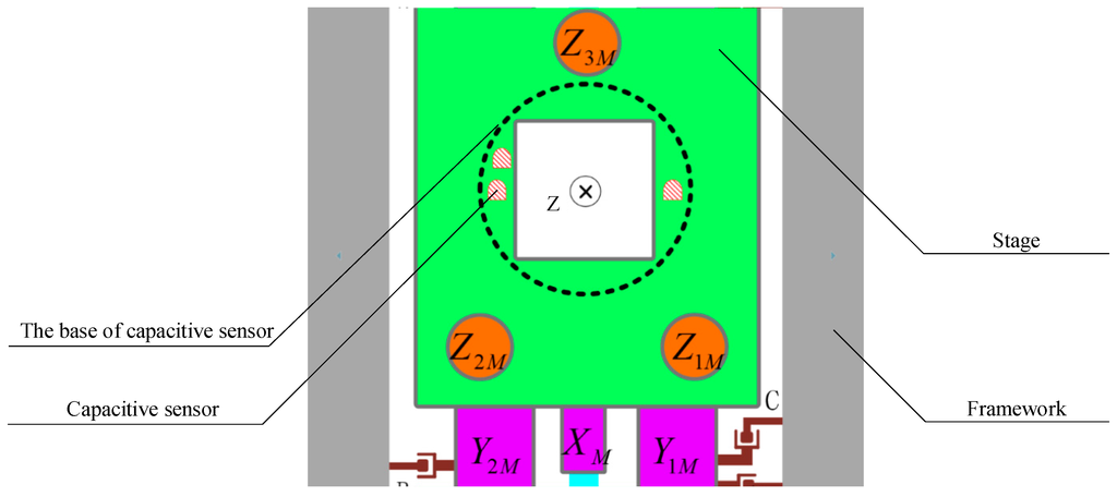 The vertical 3-DOF movement of the stage is measured by the capacitance sensors, whose layout is as shown in Figure 4. The probe of capacitance sensor is fixed on a disc-shaped base below the stage. Two capacitance sensors are installed on the X axis, symmetric to the origin, while the third capacitance sensor is located off the axis X. Each capacitance sensor could obtain the displacement of the probe relative to the framework, and the 3-DOF vertical movement of the stage relative to the framework can be calculated.