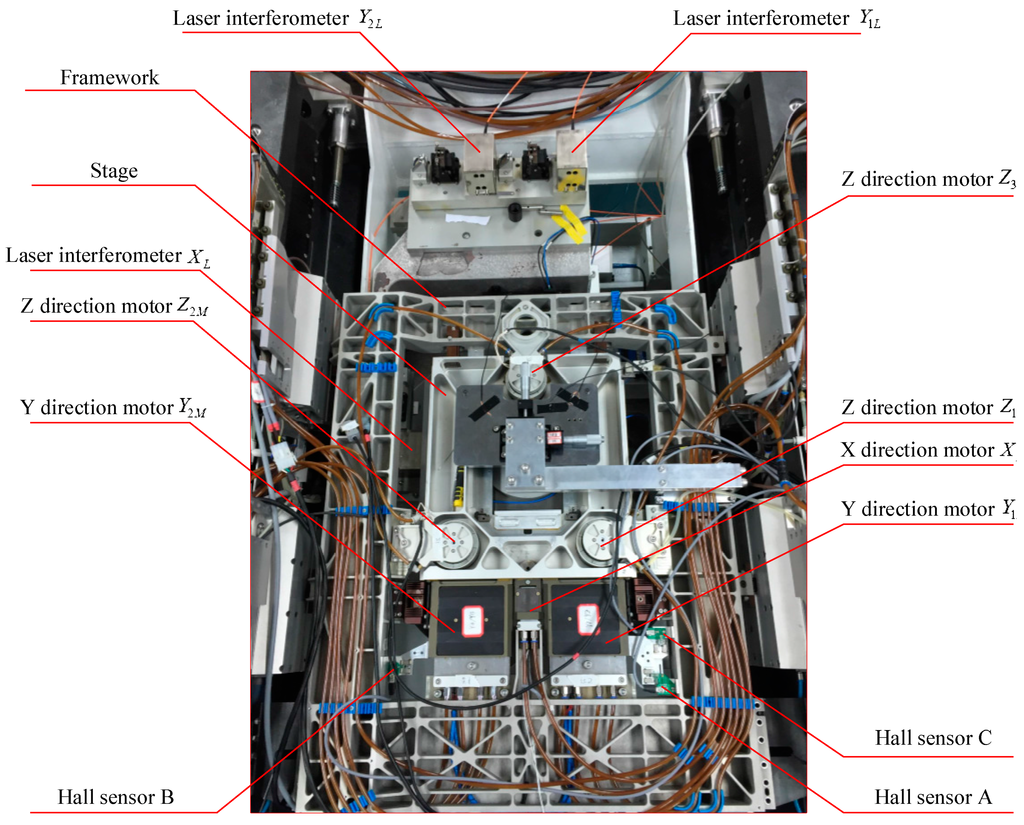 To calibrate the Hall sensor array, laser interferometers are adopted to measure the planar 3-DOF motion of the stage, acting as a reference for Hall sensor array. The investigated precision stage is shown in Figure 5.