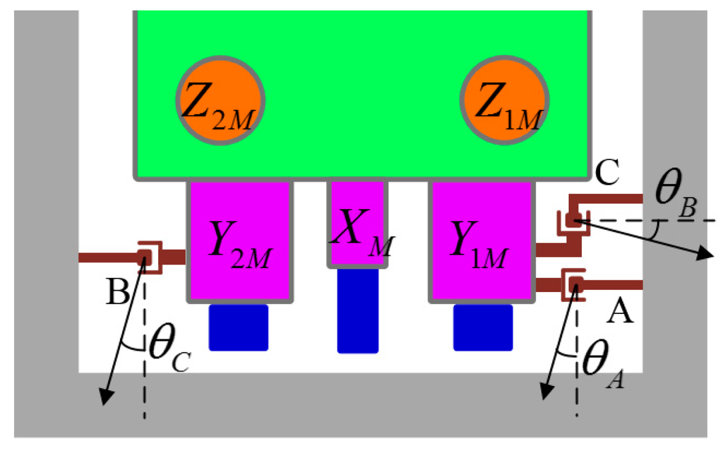 The stage is driven by six voice coil motors. Three of them, , , , are in the vertical direction, constituting an isosceles triangle. Driven by these motors, the stage could realize translation in Z axis and rotation around X, Y axis. The driving centers of and are located in the first and second quadrants of the coordinate system respectively, symmetric to the Y axis. The driving center of is on the negative Y axis. The forces of these motors are parallel to the Z axis and have the same positive direction. In the horizontal plane, two symmetrically distributed voice coil motors, and , provide driving force in Y direction. While motor , located in the middle between the two Y-direction motors, provides the driving force in X direction. The driving point of motor is located on the positive Y axis, taking positive X direction as driving direction. The driving points of and are located in the first and second quadrants, symmetric to the Y axis, taking the positive direction of Y axis as driving direction. Since the driving points of these horizontal linear motors do not coincide, the stage can achieve horizontal rotation and translation.