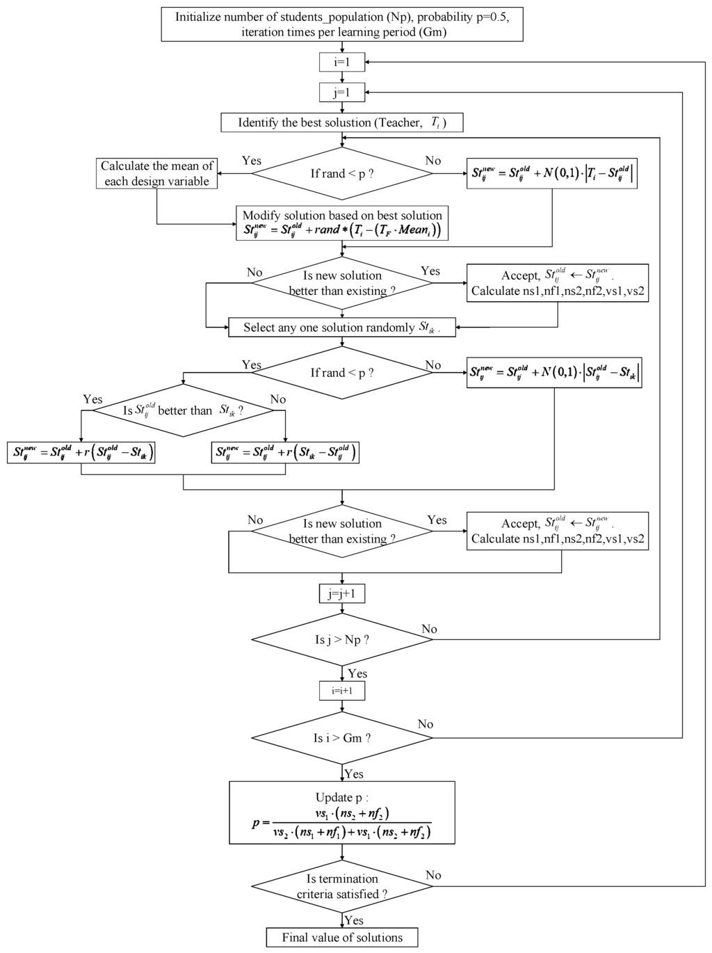 where and denote the before and after learning process respectively. is a random number in the range [0, 1]. is the teacher and is the mean at the i-th iteration. is a teaching factor set as either 1 or 2 presented as