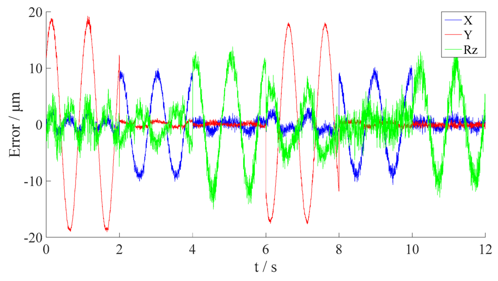 The precision stage is first controlled to stop at a fixed vertical level to avoid the disturbance induced by vertical moment. Considering the influence of vertical states on the measurements of Hall arrays, the stage is fixed at two heights: Z = −250 μm and Z = −250 μm. Then, the stage conducts the planar reset operation, providing the zero points for the 3-DOF interferometer array. After the reset, the planar motion of the stage could be measured by both the Hall sensors and the interferometers. Next, the stage is controlled to track certain trajectory with feedback from the interferometers. Then the output of the interferometers can be utilized to calibrate the Hall sensors. In this experiment, the trajectory along each axis is a sinusoidal wave: with amplitude of 300 μm and frequency of 1 Hz along X axis; 500 μm and 1 Hz along Y; 300 μrad and 1 Hz along Z. The corresponding outputs from the sensors are shown in Figure 9.