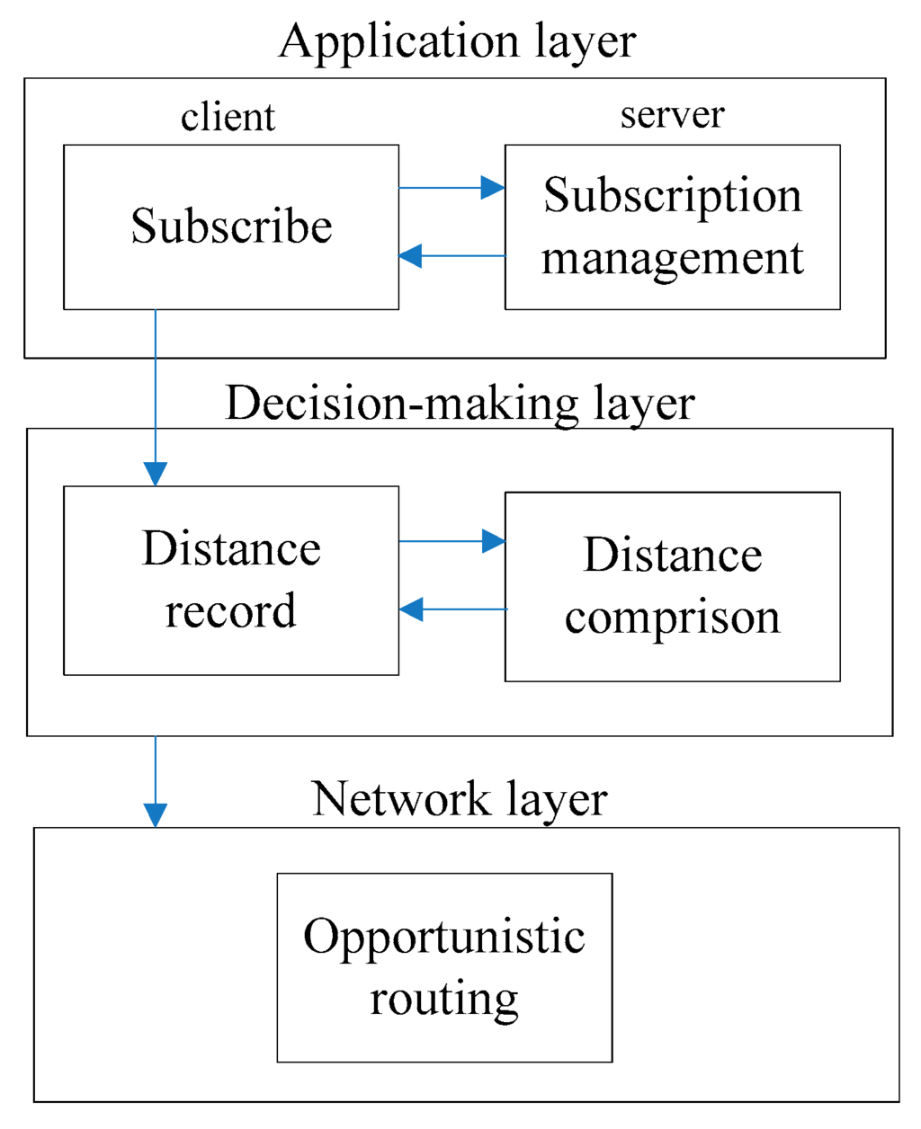 The application layer copes with the things about the subscribing content and subscription management. The decision-making layer decides whether to publish the content requested by others. The network layer deals with relay nodes selection. Different opportunistic routing protocols can be selected to work in this layer.