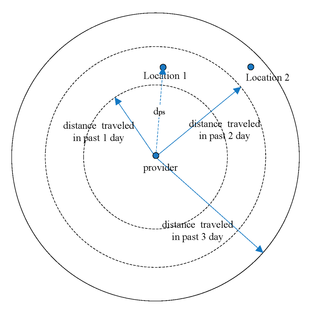 In Equation (1), Rd is the remaining days from the current date to the deadline. is the longest distance that the provider has travelled in the past Rd days. For example, if the deadline is the day after tomorrow, Rd is 2. If the subscriber’s location is at location 1 in Figure 2, the provider will publish the content. If the subscriber’s location is at location 2, the provider will not publish the content.