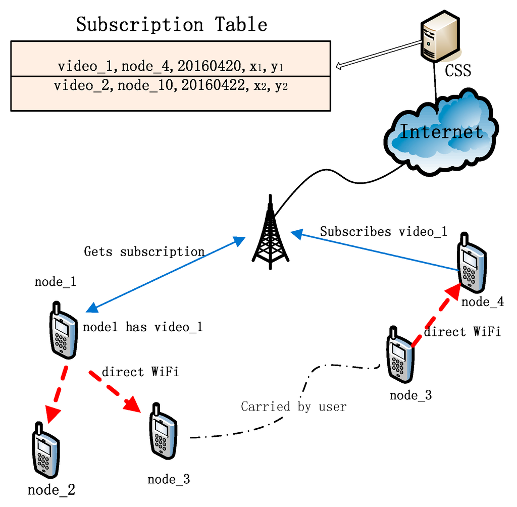 In Figure 3, node_4 subscribes to video_1 on CSS and node_1 has this video. When node_1 contacts CSS, it finds that a node subscribed video_1. Node_1 gets the deadline of the subscription and the subscriber’s location, (x1, y1). For example, if today is 19 April 2016, the remaining days from today to 20 April 2016 is 1 day. Node_1 calculates the distance between it and (x1, y1). Assume to be 4.5 km. Node_1 calculates the longest distance it travelled yesterday. Suppose to be 7 kilometers, node_1 begins to publish video_1 onto the opportunistic network through direct WiFi connections because . Node_1 sends video_1 to node_2 and node_3. Node_3 is carried by its user from one place to another place and meets node_4. Node_3 transmits video_1 to node_4 when they encounter each other.