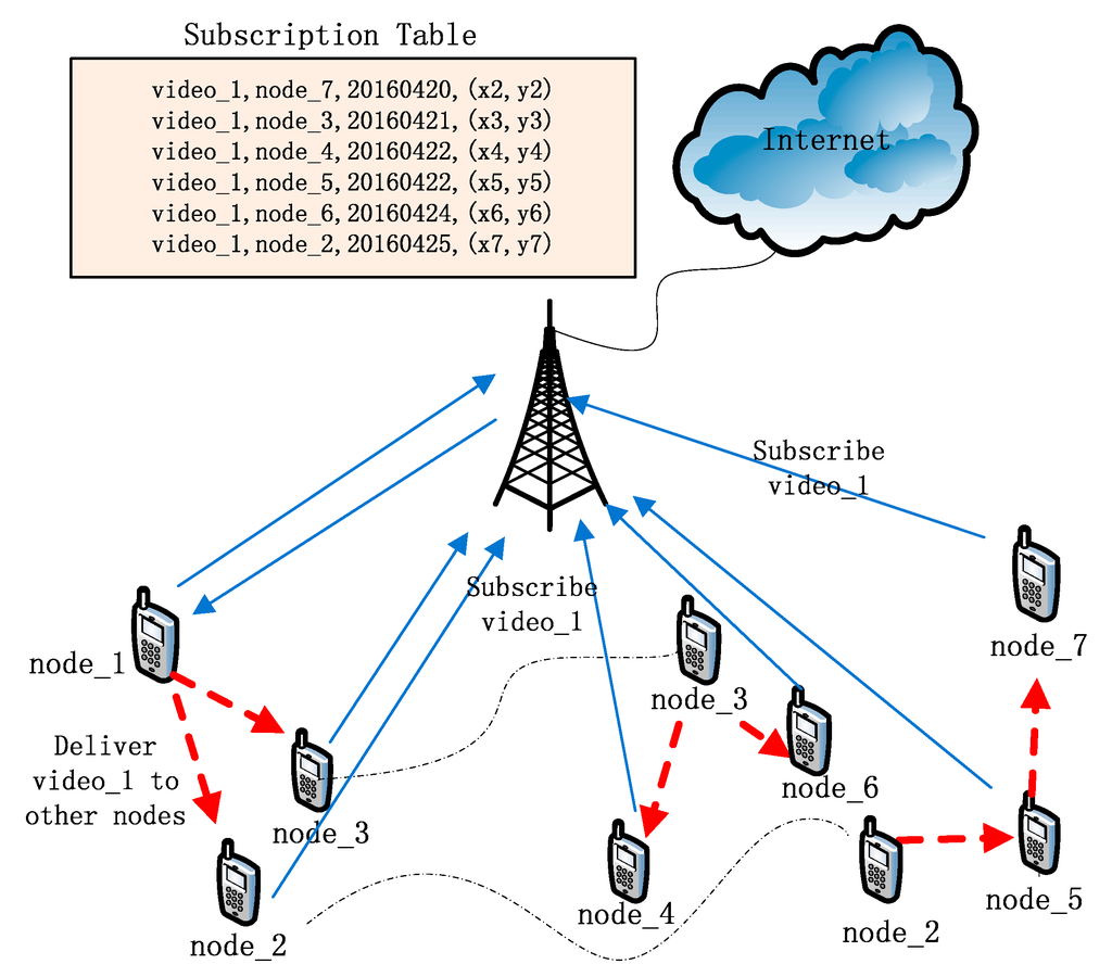 For example, node_2 to node_7 subscribed to video_1 as Figure 4 shows. Node_1 gets video_1 through a cellular network. Node_1 contacts CSS and knows that node_7 subscribed to video_1 many days ago. After comparing and , node_1 decides to send video_1 to node_7. When node_1 encounters node_2 and node_3, it sends video_1 through a direct WiFi connection to node_2 and node_3 that also have subscribed to video_1 on CSS. After these two nodes receive video_1, they repeal their subscriptions to video_1 on CSS. However, as they are not the destination of the content delivery, they continue to transmit it to other nodes, and node_2 to node_7 receive video_1 before the deadlines of their subscriptions. In this case, only when node_1 downloaded video_1 through the cellular network, 6/7 cellular network traffic is offloaded onto an opportunistic network and the offloading efficiency is 85.7%.