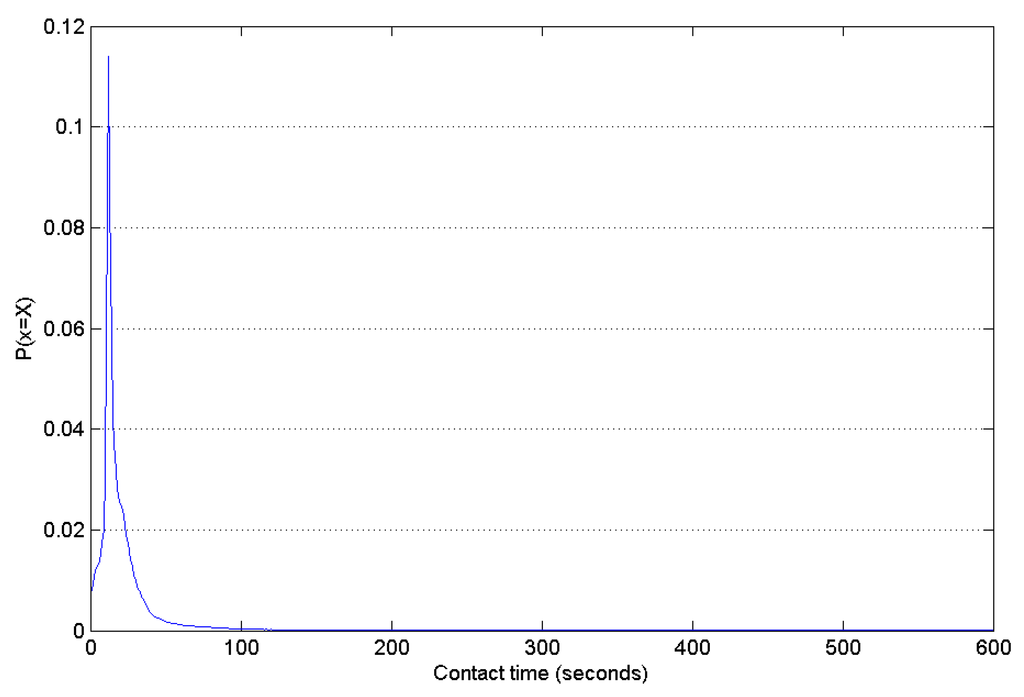 The contact time distribution between nodes indicates how much data can be transmitted and received. In the simulation, the percent of contact time shorter than 10 s is 12.2% and the percent of contact time shorter than 5 s is 5.5%, hence most of contact time is longer than 5 s as Figure 5 shows. Assuming the WiFi bandwidth to be 10 MB/s, if nodes transmit a video no larger than 55 M, the probability of transferring the file successfully among all contacts is more than 94.5%. Let P (contact time ≥ X) be the probability of contact time longer than X s.