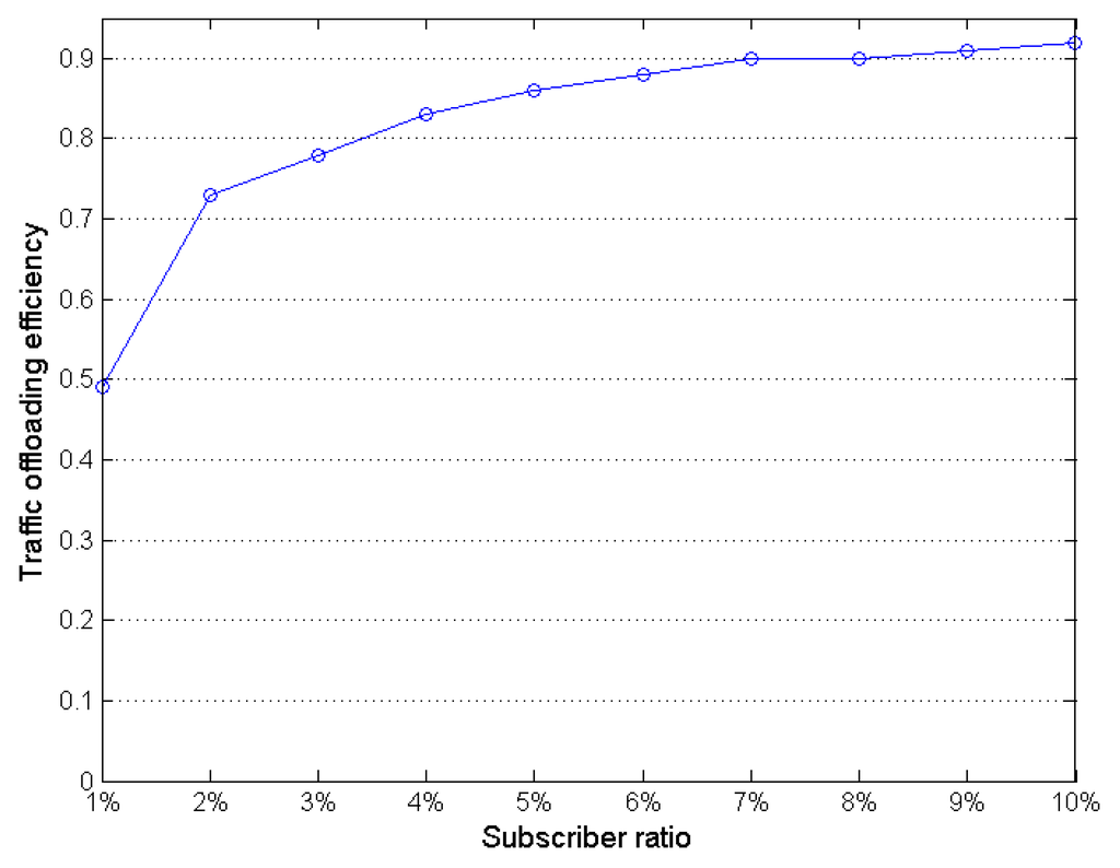 All nodes are supposed to participate in content dissemination. We assume some subscribers would request the same content. The more users are interested in the same content, the higher the offloading efficiency is. In the simulation, the average delivery ratio is 99.6%, which means that 99.6% of all users receive each file. Figure 6 shows the relation between the traffic offloading efficiency and the subscriber ratio. In our study, the total number of users is 180. If two users subscribe to the same music, the subscriber ratio is 1%. Assume one of them got the initial file through a cellular network and another got the file through opportunistic routing, then the offloading efficiency is 50%. If 16 users have subscribed a same music, the subscriber ratio is . Fifteen subscribers among them got the file by opportunistic routing, so the offloading efficiency is . As the delivery ratio of the simulation was very high (99.6%), the morphological feature of the curve in Figure 6 approximates the morphological feature of . When the subscriber ratio increases at the beginning phase, the offloading efficiency increases rapidly. When the subscriber ratio is larger than 7%, the growth rate of offloading efficiency slows down.
