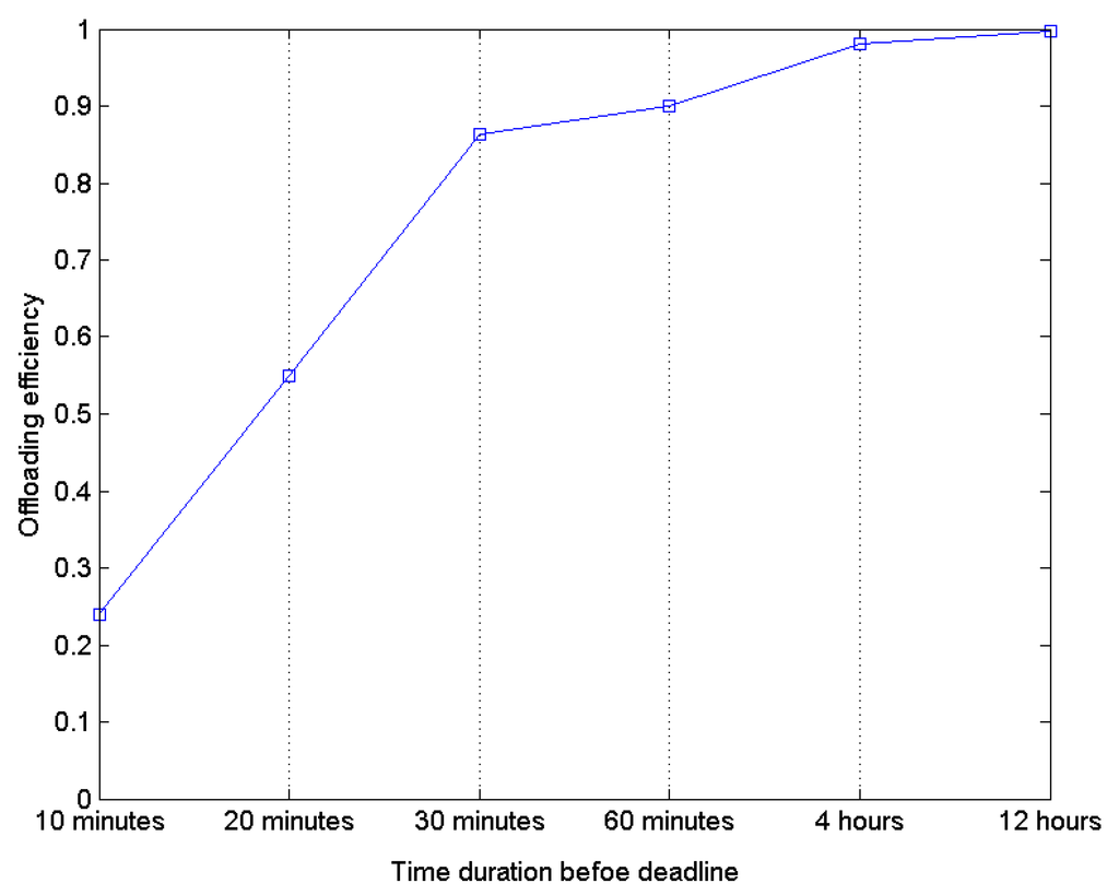The time length before the deadline impacts the offloading efficiency. If a user sets the deadline just 10 min later, it means the user potentially hopes the content provider to be nearby. However, the probability of this situation being true is very low. If the user can wait several hours to get the content, more users would access CSS and the probability that a provider sends the requested content to the subscriber increases, as Figure 7 shows.