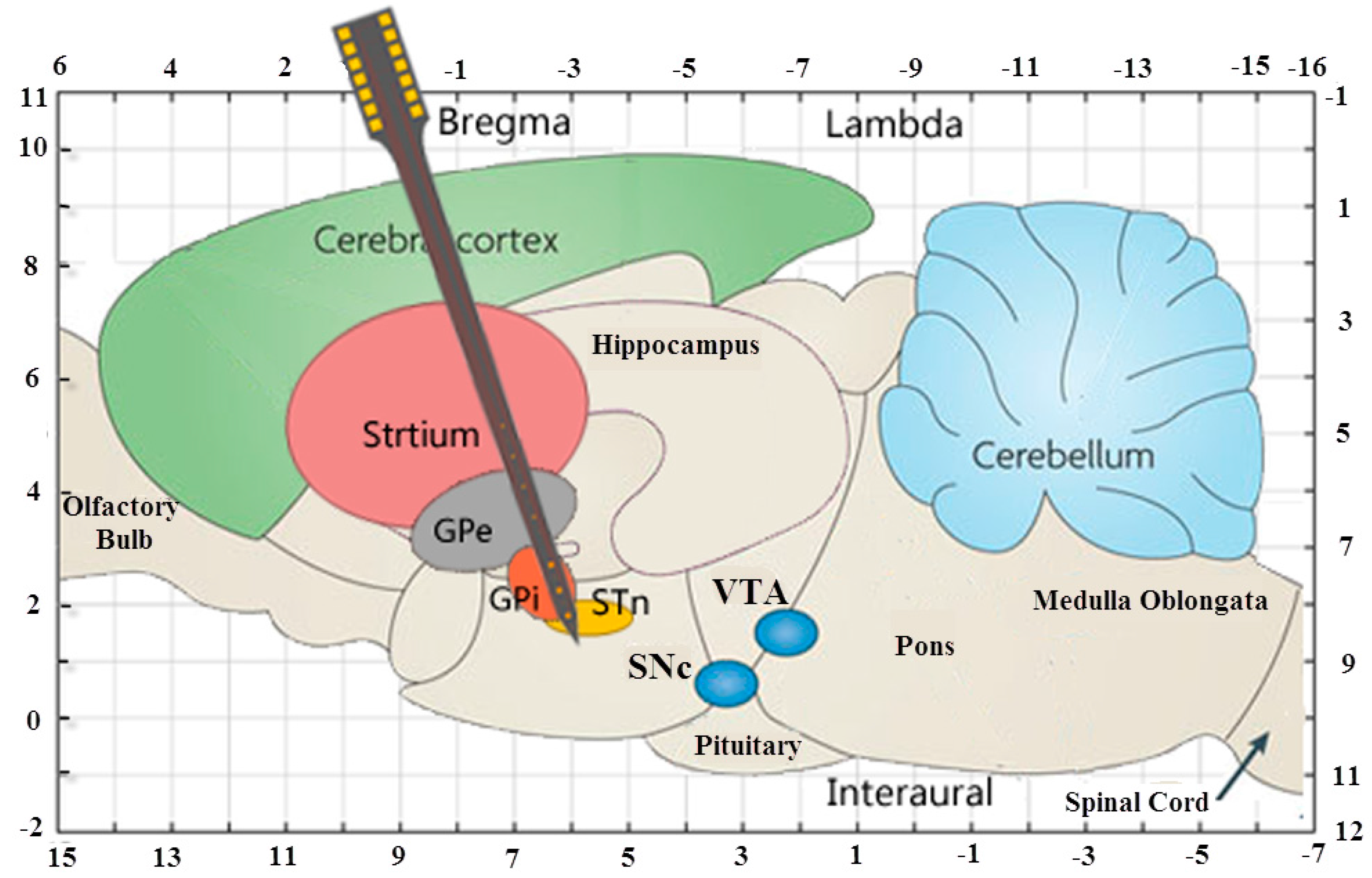 Schematic diagram of median sagittal plane of Sprague-Dawley rat brains showing the relative positional relationship of the STN, GPi and striatum (coordinate unit: mm).
