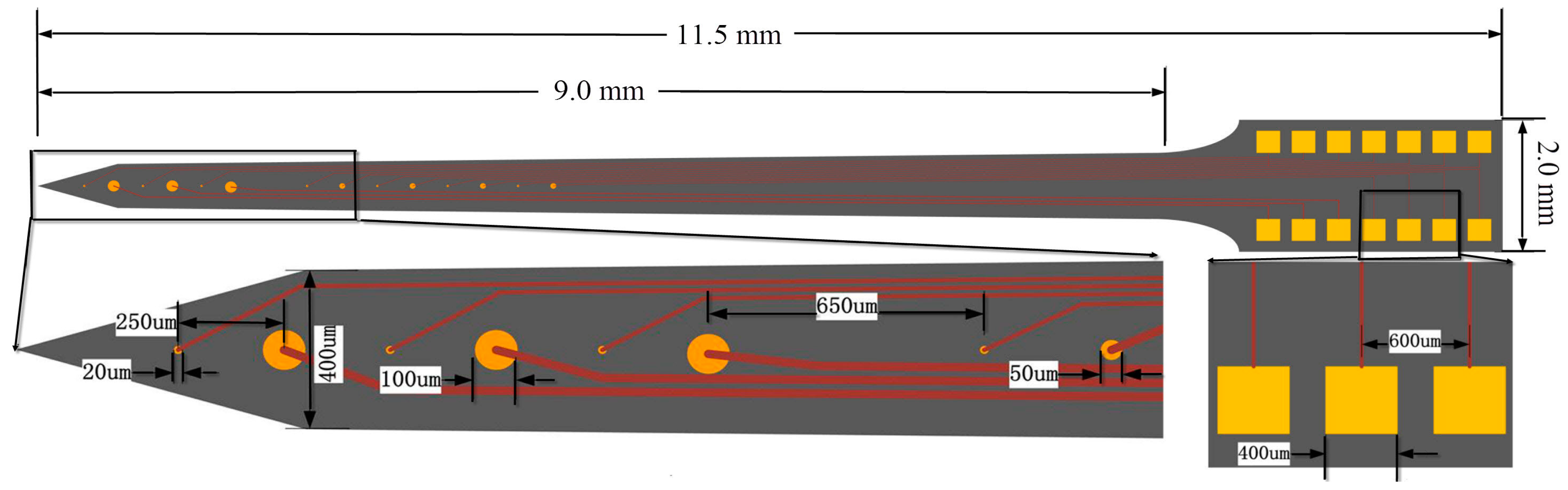 The microelectrode arrays were designed according to the size of rat brain and relative positional relationship of the STN, GPi and striatum of BGS (Figure 1), and our purpose was to simultaneously record electrophysiological information from the striatum, GPi and STN of BGS. Figure 2 shows the detailed design parameters. The designed microelectrode array with dimensions of 9 mm × 400 μm × 200 μm (l × w × t) employed 14 round-shaped gold microelectrode sites distributed on each side. These sites could be divided into three types: three stimulating sites (diameter of 100 μm), seven electrophysiological recording sites (diameter of 20 μm) and four sites with diameter of 50 μm used for other experimental purposes in the future. For example, these 50 μm sites could be modified with the ion-exchange resin Nafion for detection of neurotransmitter dopamine [49], or modified with a protein matrix layer containing l-glutamate oxidase as glutamate sensors [50]. At the front of the designed microelectrode, three stimulating sites and three recording sites were mutually spaced with equal center-to-center distance of 250 μm. The distance between the tip and the center of the first recording site was 300 μm, defined by the fabrication process. These four sites with diameter of 50 μm and four recording sites were also mutually spaced with equal center-to-center distance of 250 μm. Each recording site was electrically connected to a bonding pad (400 μm × 400 μm) via 5 μm-wide gold conductive paths with 5 μm-wide gaps between them, and each stimulating site was electrically connected to a bonding pad via 10 μm-wide gold conductive paths with 5 μm-wide gaps between them.