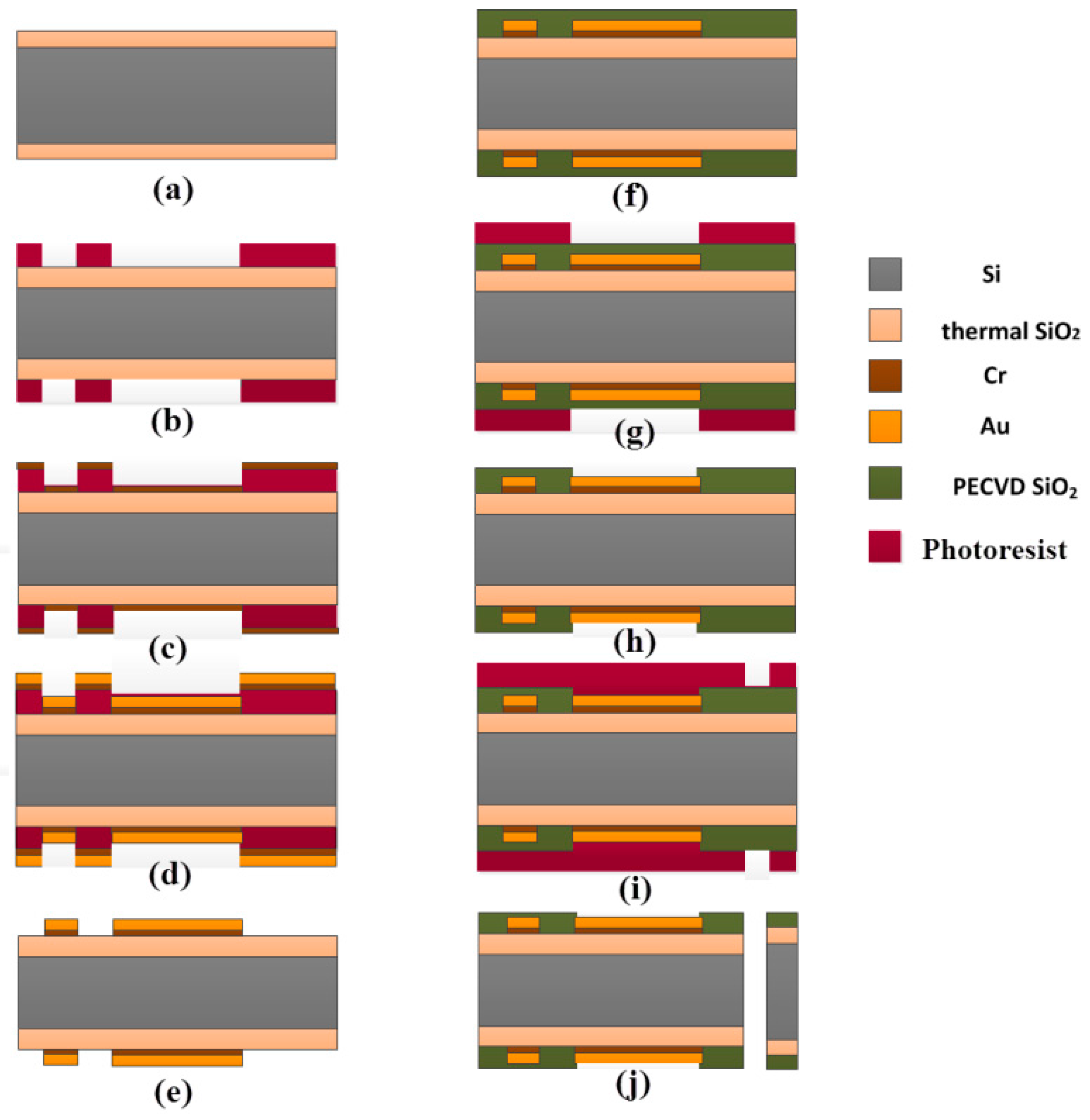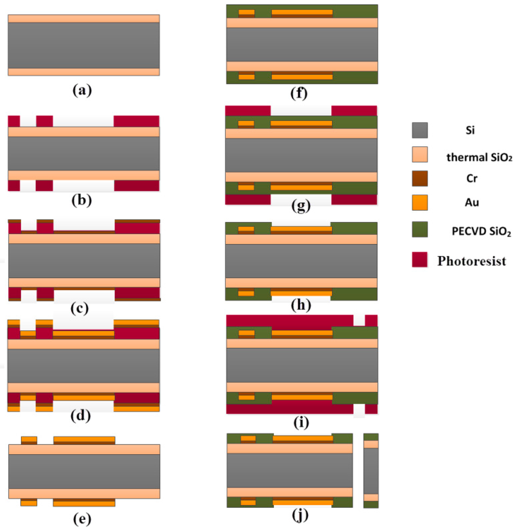 Schematic diagram of the process flow: (a) thermal oxidation; (b) spinning photoresist and patterning by lithography; (c) deposition of adhesion layer Cr; (d) deposition of Au layer; (e) lifting off the unpatterned metal and photoresist; (f) deposition of dielectric PECVD SiO2 layers; (g) spinning photoresist for patterning passivation layer; (h) exposing electrode sites and bonding pads; (i) spinning photoresist for DRIE; (j) DRIE and device release.
