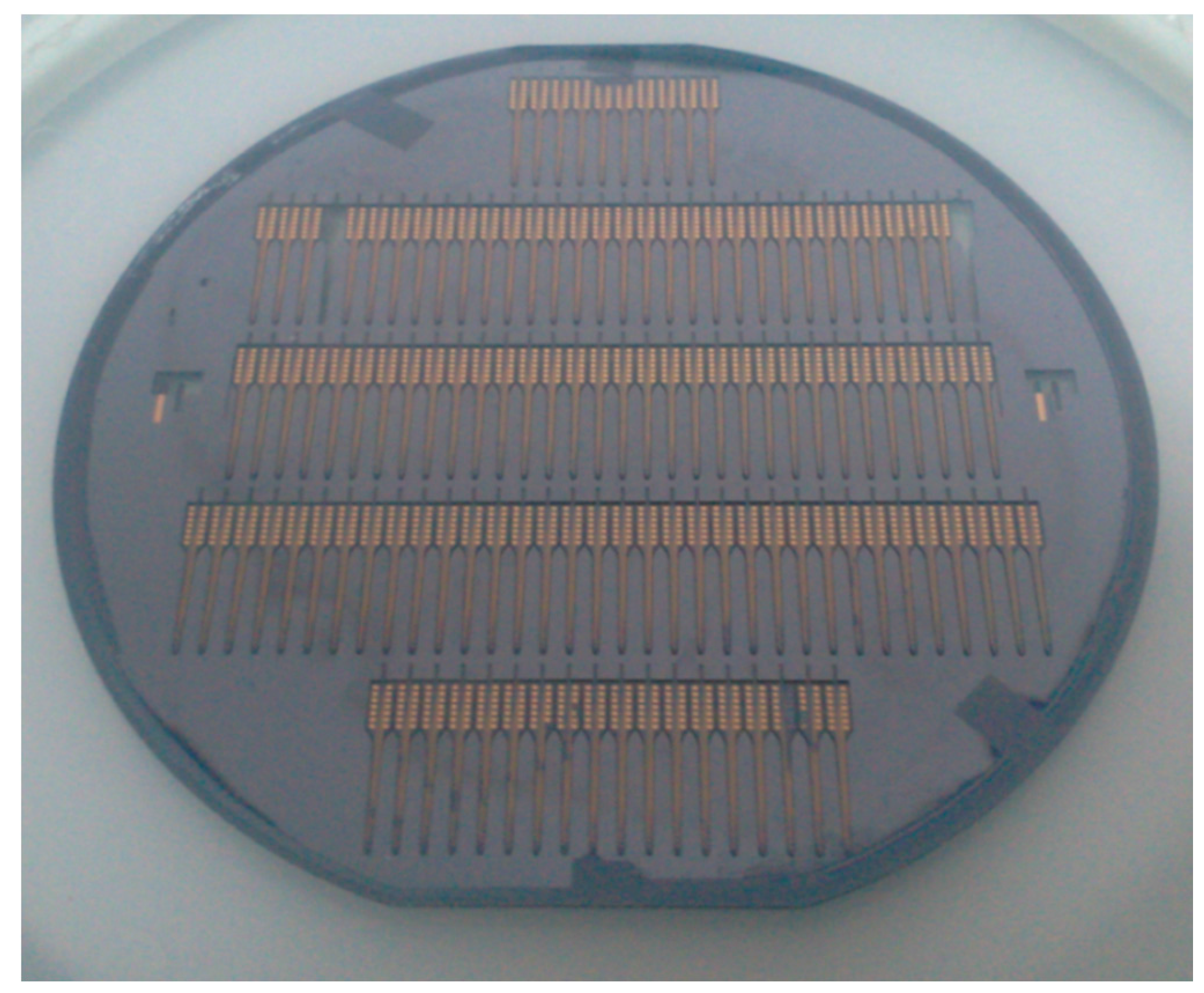 Figure 3 showed the main fabrication process for a silicon-based microelectrode array. The substrate was typically comprised of about 100 mm diameter, double-side polished, p-doped (1 0 0) silicon wafers with a thickness of 200 μm. In the first step, the substrate was thermally oxidized at 1150 °C to yield a 1.5 μm silicon dioxide (SiO2) on both sides as an insulating layer (Figure 3a). Secondly, a 5 μm-thick negative tone photoresist (nLOF-2035, AZ Electronic Materials) was spun on and patterned to define the metal layer comprising the electrode sites, interconnecting wires and bonding pads by lithography (Figure 3b). This was followed by sputtering 20 nm-thick chromium (Cr) as an adhesion layer (Figure 3c) and evaporating a 300 nm-thick gold (Au) layer (Figure 3d) sequentially. The lift-off process was used to lift off the unpatterned metal and photoresist by dissolving the photoresist in an amine-solvent mixture (Figure 3e). Thirdly, the subsequent 2 μm-thick SiO2 passivation layer was made from plasma-enhanced chemical vapor deposition (PECVD) (Figure 3f). This passivation layer was patterned using reactive ion etching (RIE) through the photoresist as a hard mask (Figure 3g) to open electrode sites and bonding pads (Figure 3h). After the process on the front side, the wafer was turned over to repeat the above steps in the back. After that, additional twice lithography, left-off and RIE steps defined the dimensions of probes to realize the outline from the front and back surface of wafer by removing SiO2 outside the probe. Finally, a 10 μm-thick photoresist (AZ-9260, AZ Electronic Materials) was applied to serve as the etch mask layer (Figure 3i) and deep reactive ion etching (DRIE) was used to release the probes from the wafer (Figure 3j). The overview of an entire silicon wafer with the probes and frames is shown in Figure 4.