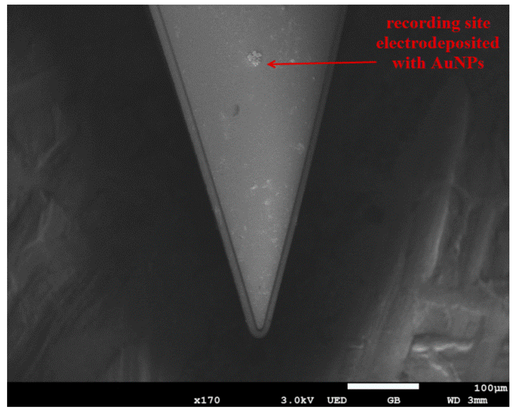 The surface morphologies of the fabricated microelectrode array were examined by scanning electron microscopy (SEM), and here we mainly studied the morphological characterization of stimulating sites (diameter of 100 μm) and recording sites (diameter of 20 μm). As shown in Figure 6a, the recording site with a diameter of 20 μm possessed a round shape and smooth surface. Moreover, 5 μm-wide interconnecting wire connected with the sites was also visible. After electrodeposition of AuNPs (Figure 6c), dendritic nanoparticles with a 3D structure grown on the surface of the recording site, which could greatly increase the surface roughness, reduced the impedance of the electrode site and facilitated neural recordings. Figure 6b shows that the stimulating site with a diameter of 100 μm also had a round shape and smooth surface, and the inset figure with higher magnification indicates that there was a clear boundary between the gold layer and thermally oxidized SiO2, which illustrated that the passivation layer was well removed by reactive ion etching (RIE). After electrodeposition of AuNPs (Figure 6d), lots of gold nanoparticles were densely and uniformly distributed on the surface of the stimulating site, which greatly reduced impedance, increased surface roughness and enhanced the charge injection capability of stimulating sites [56]. Figure 7 showed an SEM image of the tip of a microelectrode array and a recording site located at the tip of the electrode shank. It could be clearly observed that a sharp tip geometry with accurate shape was presented, indicating that the microelectrode arrays were well released from silicon wafer by deep reactive ion etching (DRIE).
